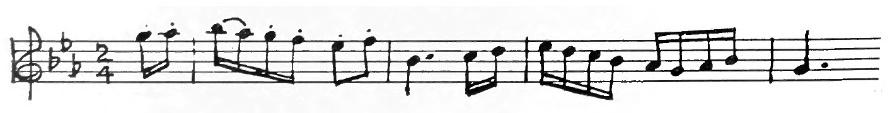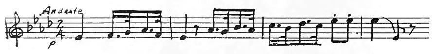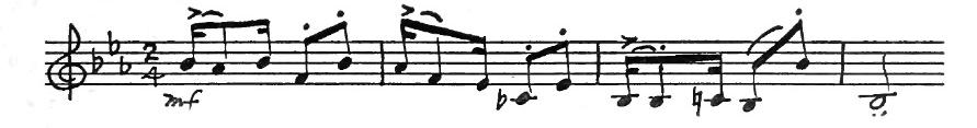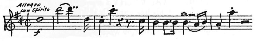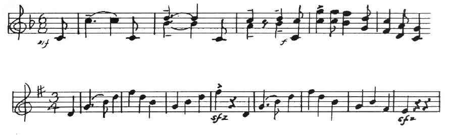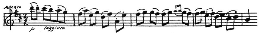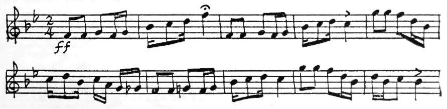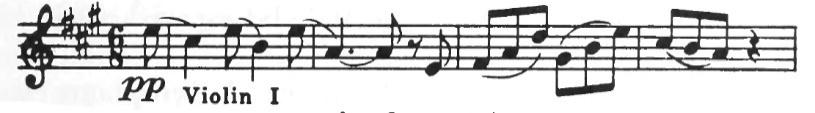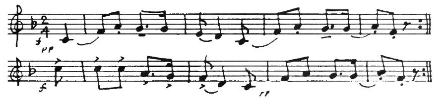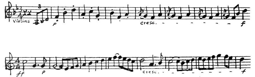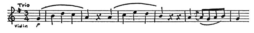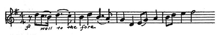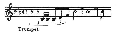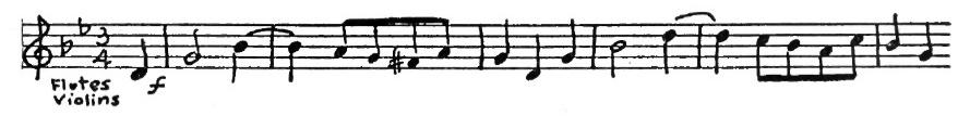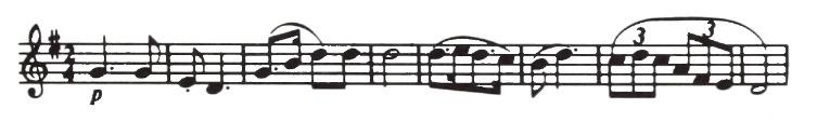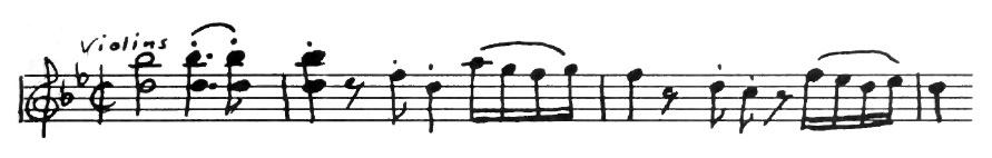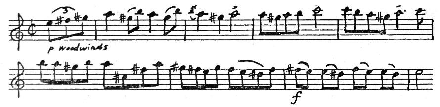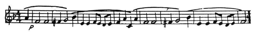 An American composer, Robert McBride, had an original idea one day. He decided to use this tune for the subject of a fugue. As you may remember from having listened to Bach’s Little Fugue in G Minor, the subject comes back again and again. Every time you hear it, the sensation is a pleasant one like meeting a familiar friend. In McBride’s Fugue the subject first appears in the violins in the key of G. They play the tune differently from the way you play it on the piano. Each note is made into two eighth notes.