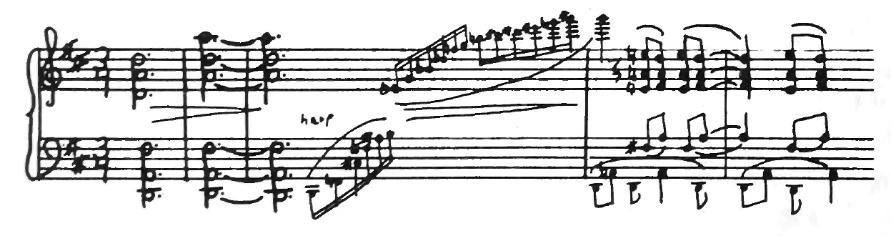 The Clog Dance begins with a piano strumming a fast even rhythm. The composer tells us that as many as twenty pianos may be used! The tune is from his unfinished variations on Handel’s Harmonious Blacksmith.