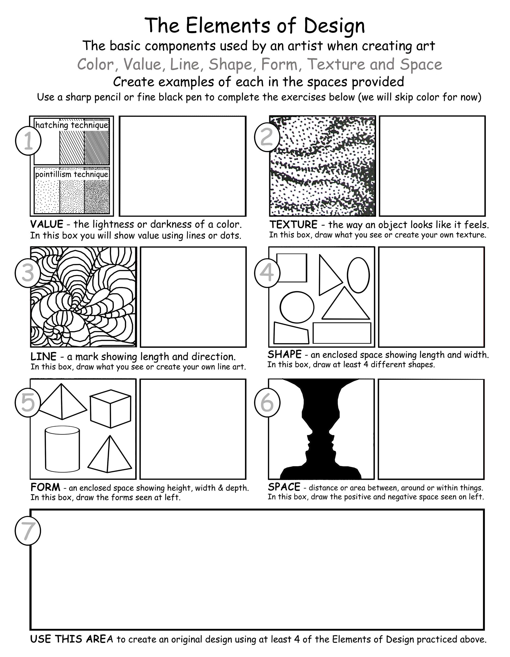 Elements of Design: Color, value, line, shape, form, texture and space.