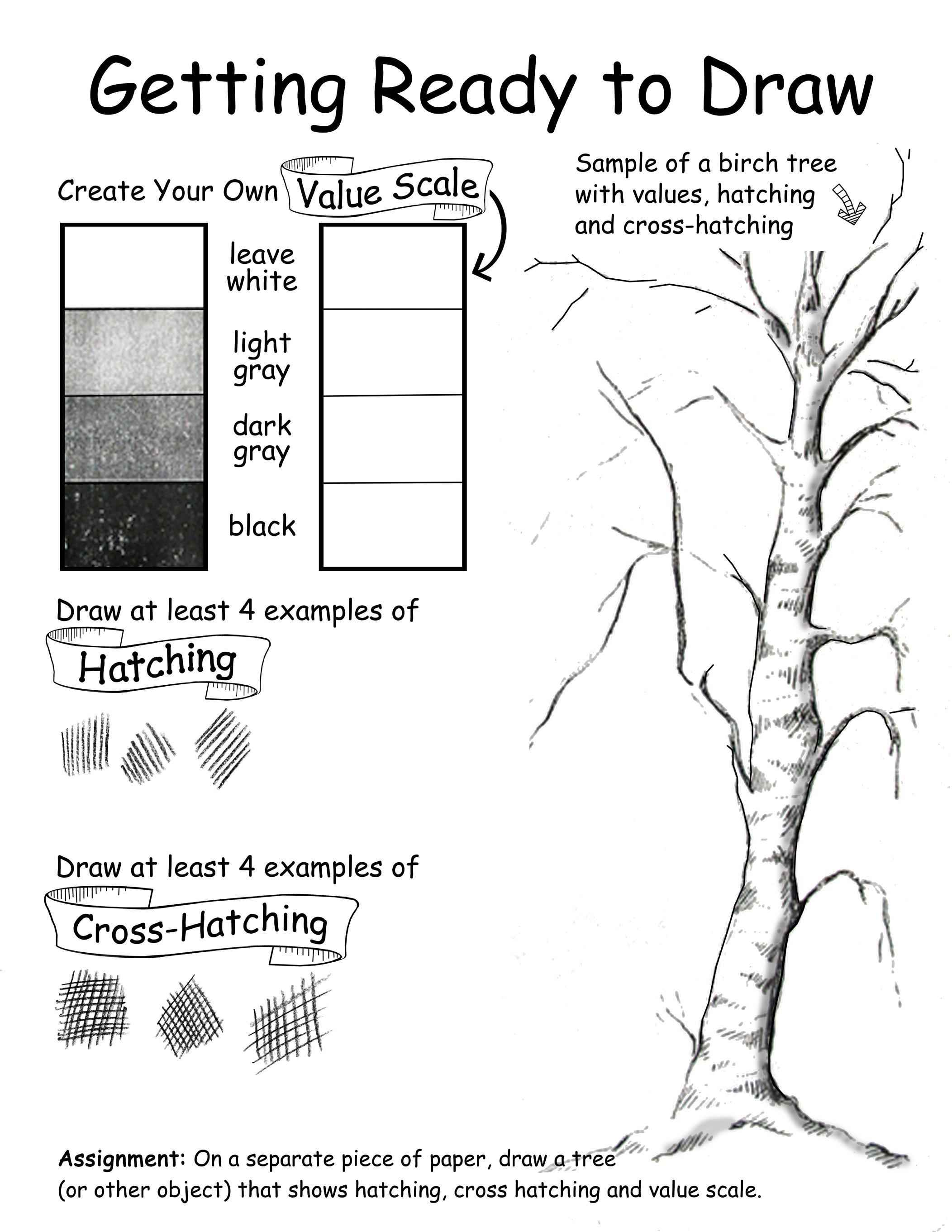 To practice different types of shading, complete the value scale, hatching, and cross-hatching exercises in the area provided. On a separate piece of paper, draw a tree (or other object) that includes the types of shading practiced.