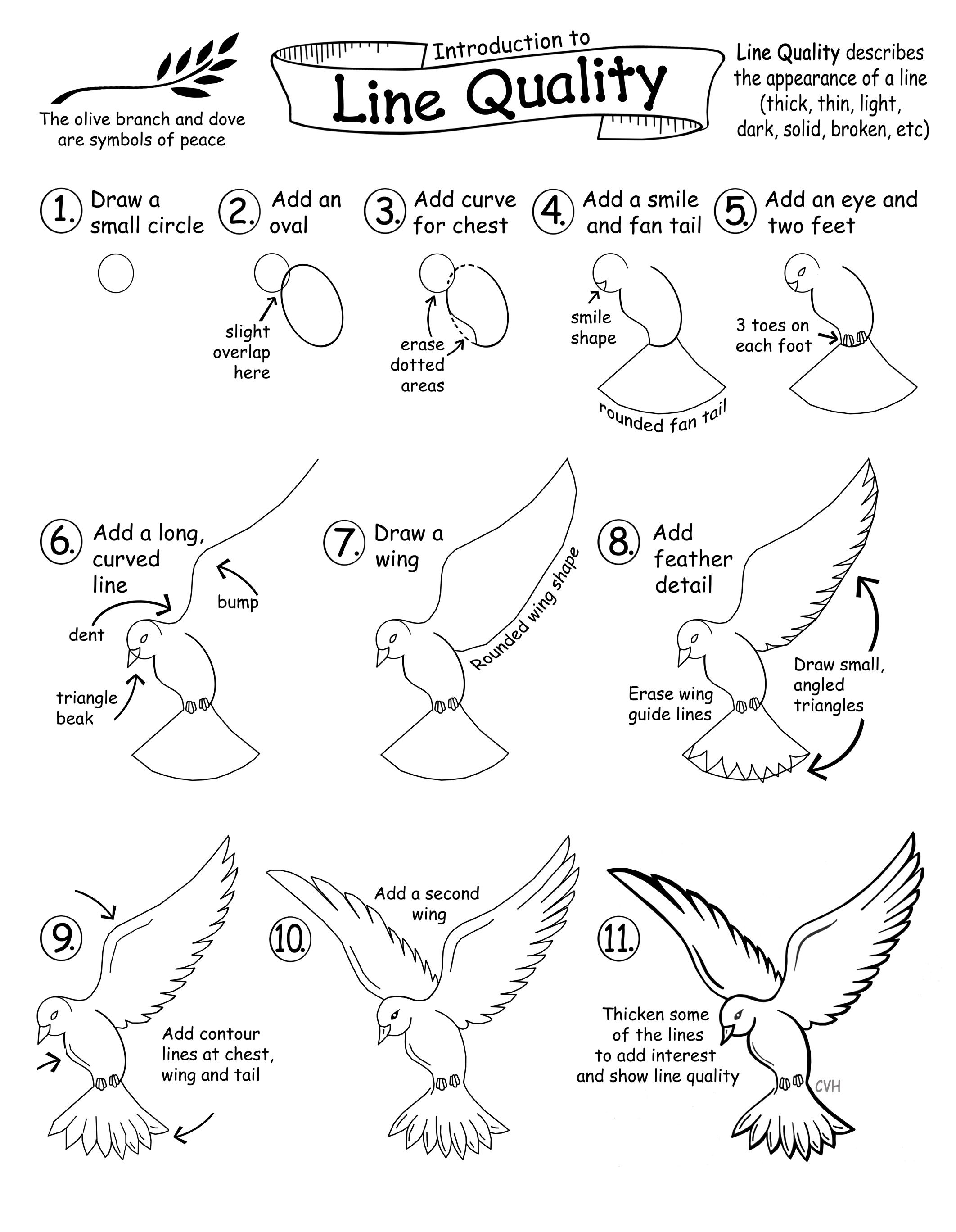 Create an original image using detailed line art that focuses on line quality. Experiment by drawing the artwork of the dove provided, and add line weight in the contour areas highlighted. Next, apply this technique to an item of your choosing, making sure to vary line weight so that some lines appear to advance (thicker) and others to recede (thinner).