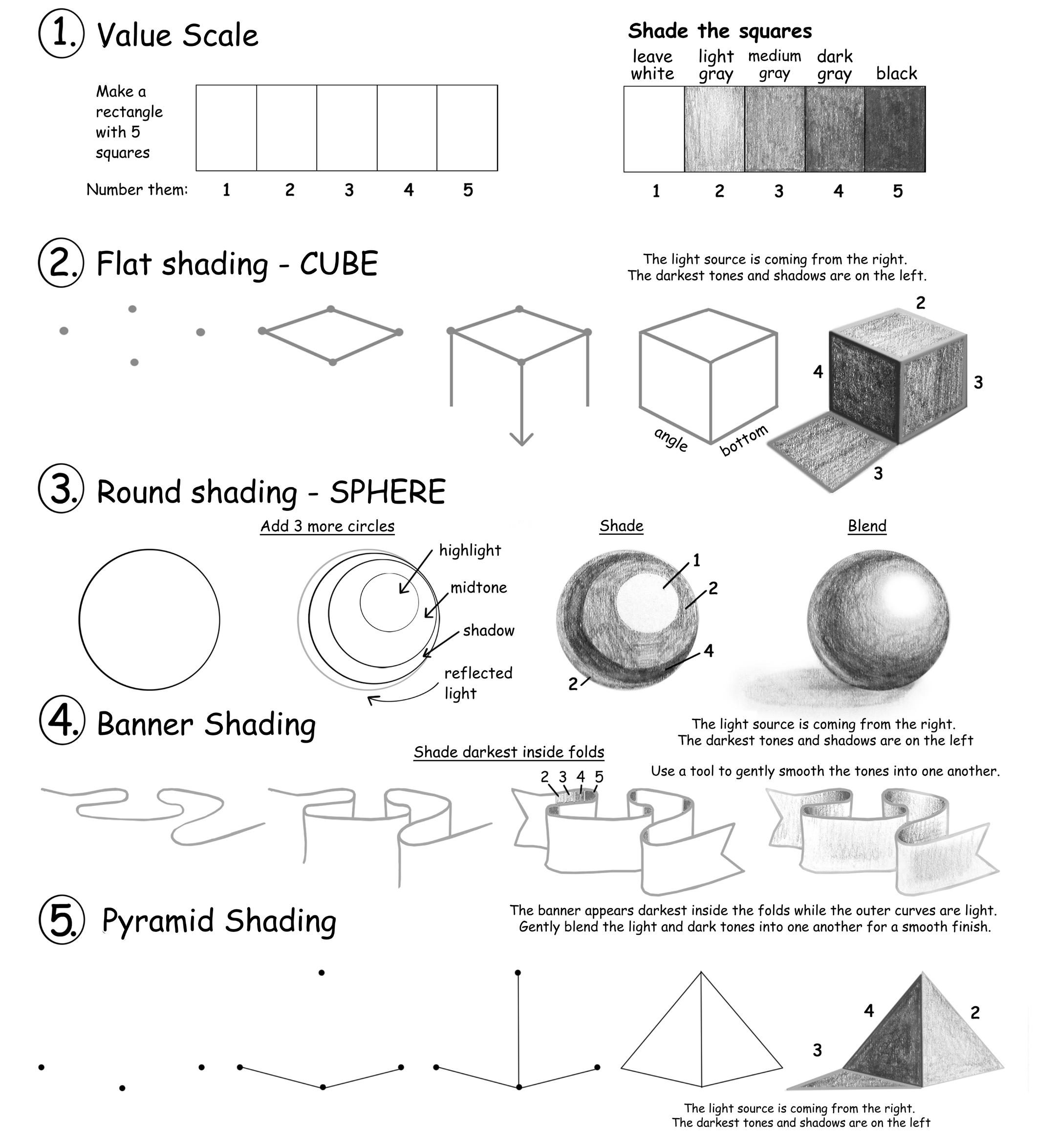 • Recreate the 9 examples provided in “Shading Shapes,” starting with the Value Scale.