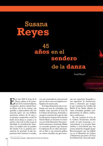 con una trascendencia internacional que la coloca como una legítima embajadora de nuestro país. A lo largo del presente año se realizarán una serie de actividades que tendrán como epicentro la Casa de la Cultura Ecuatoriana, destinadas a recoger la memoria de lo que ha sido la trayectoria y el aporte de la maestra Susana Reyes; se iniciaron en marzo con una Gala Dancística Internacional de aniversario y homenaje. Habrá un recorrido posterior que abarcará la realización de un video documental, un libro y una memoria gráfica, un estreno mundial, una gira nacio-