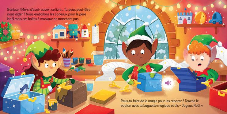La Navidad adquiere un aire especial en este libro sonoro. Al tocar las páginas con la varita mágica que viene incorporada en la cubierta del libro, se pueden escuchar cinco hechizos distintos. Las escenas muestran a Papá Noel y a sus duendes preparándose para el gran día, ya sea reparando juguetes rotos o enseñando a los renos a volar más rápido.