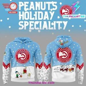 The front of the hoodie features a vibrant Atlanta Hawks logo, seamlessly paired with Snoopy lounging atop a basketball—a whimsical nod to the partnership between the Peanuts gang and the Hawks. Bold Hawks team colors dominate the design, with red, black, and white accents creating a sleek and dynamic look.