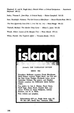 The New Quarterly Cave (Vol. I, 1·4: Vol. II, 1·4) - Hans Hauge 185 (I) Thelwell, Michael: The Harder They Come - Albert L. Jones 151 (2) Wendt, Albert: Leaves of the Banyan Tree - Peter Alcock 175 (1) White, Patrick: The Twybom Affair - Veronica Brady 178 (1)