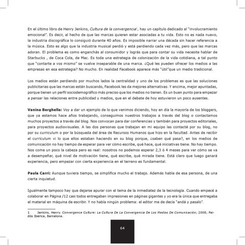 En el último libro de Henry Jenkins, Cultura de la convergencia1, hay un capítulo dedicado al “involucramiento emocional”. Es decir, al hecho de que las marcas quieren estar asociadas a tu vida. Esto no es nada nuevo, la industria discográfica lo consiguió durante 40 años. Es imposible narrar una década sin hacer referencia a la música. Esto es algo que la industria musical perdió y está perdiendo cada vez más, pero que las marcas adoran. El problema es como enganchás al consumidor y lográs que para contar su vida necesite hablar de Starbucks , de Coca Cola, de Mac. Es toda una estrategia de colonización de la vida cotidiana, a tal punto que “contarte a vos mismo” se vuelve inseparable de una marca. ¿Qué les pueden ofrecer los medios a las empresas en esa estrategia? No mucho. En realidad Facebook aparece más “útil”que un medio tradicional. Los medios están perdiendo por muchos lados la centralidad y uno de los problemas es que las soluciones publicitarias que las marcas están buscando, Facebook les da mejores alternativas. Y encima, mejor apuntadas, porque tienen un perfil sociodemográfico más preciso que los medios no tienen. Es un buen punto para empezar a pensar las relaciones entre publicidad y medios, que en el debate de hoy estuvieron un poco ausentes. Vanina Berghella: Voy a dar un ejemplo de lo que venimos diciendo, hoy en día la mayoría de los bloggers, que ya estamos hace años trabajando, conseguimos nuestros trabajos a través del blog o contactamos muchos proyectos a través del blog. Nos convocan para dar conferencias y también para proyectos editoriales, para proyectos audiovisuales. A las dos personas que trabajan en mi equipo las contacté por su blog, no por su curriculum o por la búsqueda del área de Recursos Humanos que hizo en la facultad. Antes de recibir el currículum vi lo que ellos estaban haciendo en su blog porque, ¿saben qué pasa?, en los medios de comunicación no hay tiempo de esperar para ver cómo escribe, qué hace, qué iniciativas tiene. No hay tiempo. Nos come un poco la cabeza pero es real: nosotros no podemos esperar 2,3 ó 4 meses para ver cómo se va a desempeñar, qué nivel de motivación tiene, qué escribe, qué mirada tiene. Está claro que luego ganará experiencia, pero empezar con cierta experiencia en el terreno es fundamental. Paula Carri: Aunque tuviera tiempo, se simplifica mucho el trabajo. Además habla de esa persona, de una cierta inquietud. Igualmente tampoco hay que dejarse apurar con el tema de la inmediatez de la tecnología. Cuando empecé a colaborar en Página /12 casi todos entregaban impresiones en páginas gigantes y yo era la única que entregaba el material en máquina de escribir. Y no había ningún problema: el editor me de decía “andá y pasalo”. 1 Jenkins, Henry. Convergence Culture: La Cultura De La Convergencia De Los Medios De Comunicación; 2008; Paidós Ibérica, Barcelona.