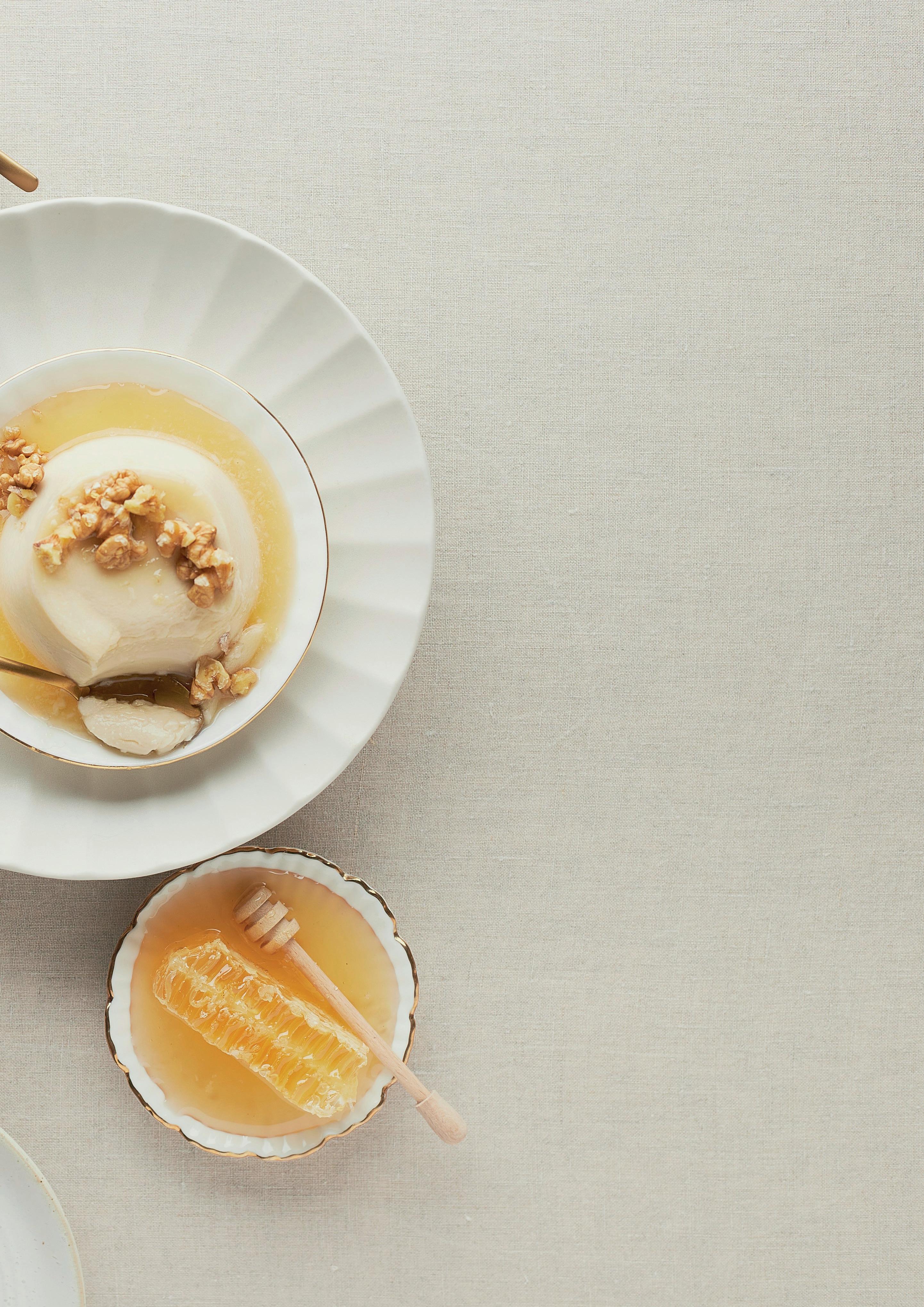 Serveer de panna cotta met een straaltje honing en de geroosterde walnoten bovenop.