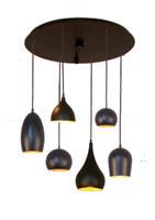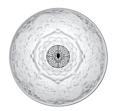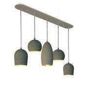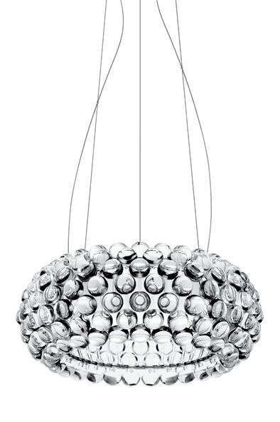 Der Schirm der Pendelleuchte Caboche besteht aus Kugeln aus Polymethylmethacrylat. Die ringförmige, geometrische Anordnung der Kugeln vervielfältigt das Licht der zentralen Lichtquelle.