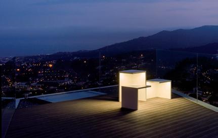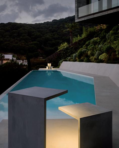 Bild unten und links (Kasten): Empty Bodenleuchte für den Aussenbereich. Erhältlich in unterschiedlichen Größen. Herstellernachweis: Vibia. Design: Xucla.