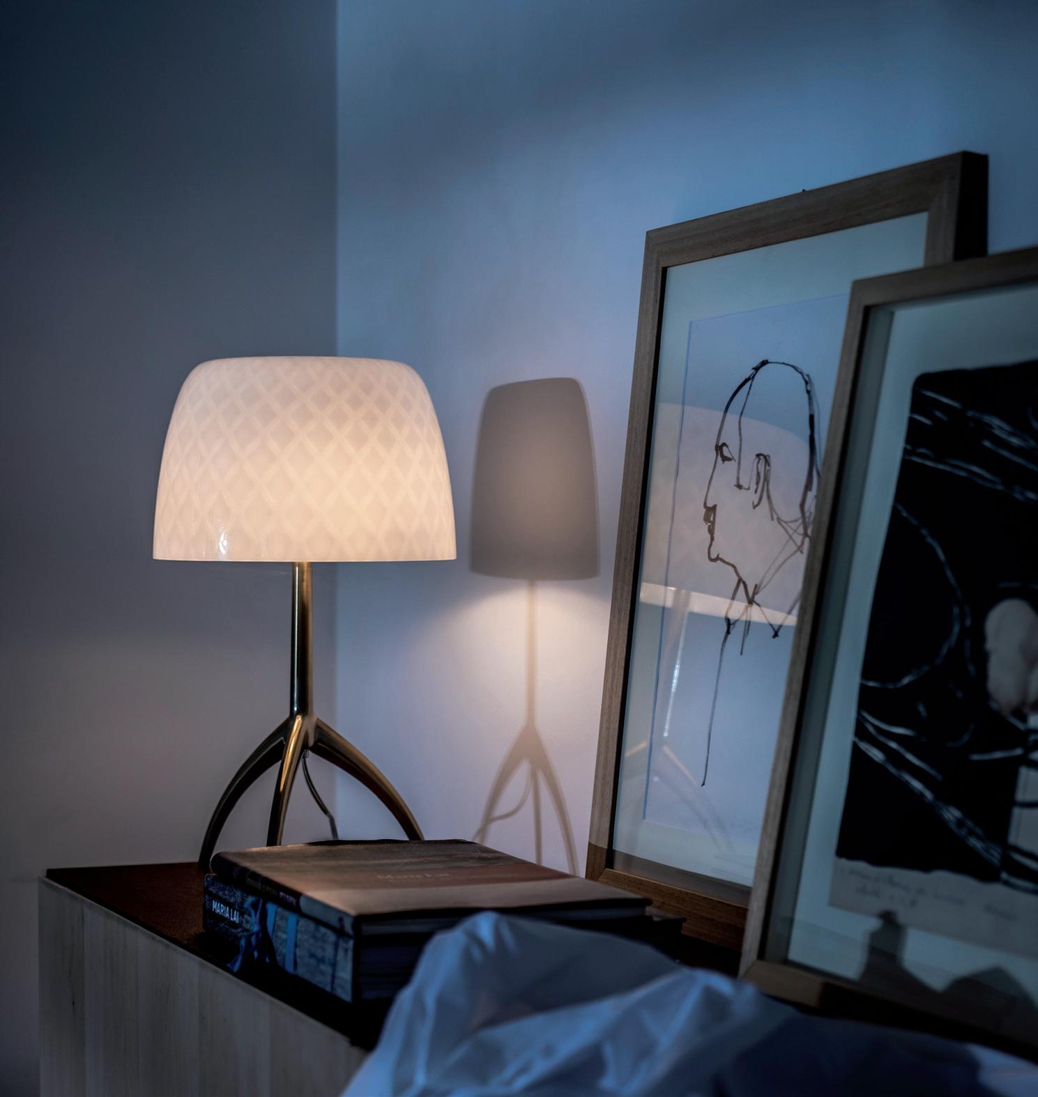 Die Leuchte Lumiere, ein Entwurf von Rodolfo Dordoni aus dem Jahr 1990, gilt dank ihres Diffusors aus mundgeblasenem Glas und des unnachahmlichen Aluminiumstativs heute als Designikone. Lumiere ist nun in drei neuen Farben erhältlich: Cipria, ein faszinierendes Puderrosa; Creta, ein raffiniertes Graugrün; und Sahara, eine warme Farbe wie der Sand der Wüste (Abb. rechts).