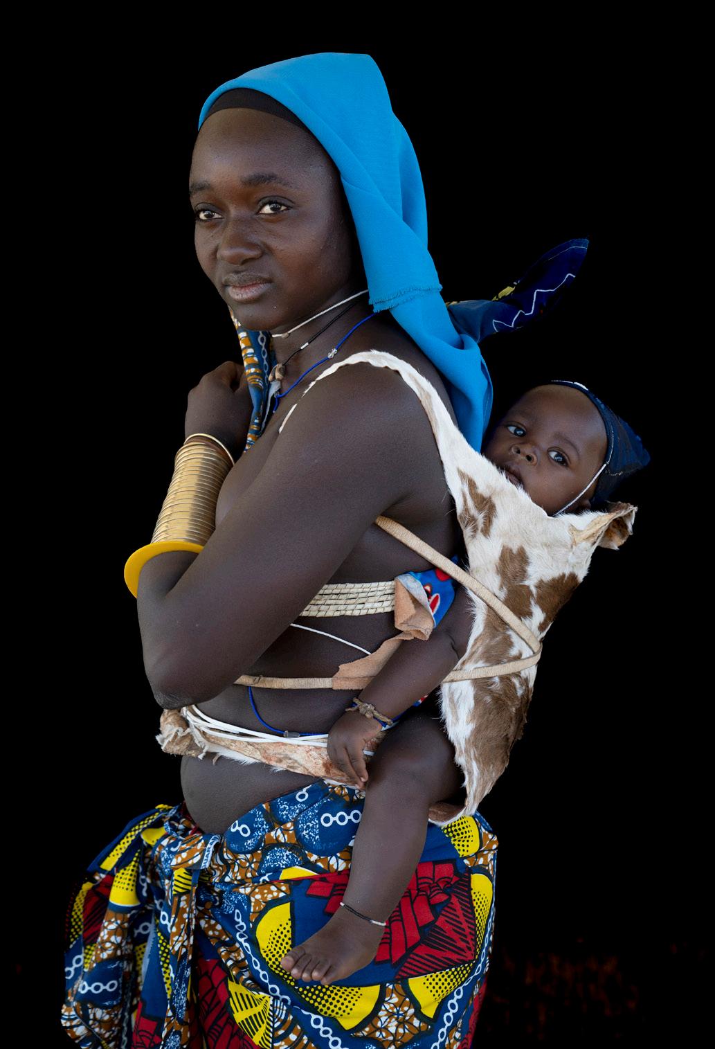 The Mucubal Tribe are beautifully dressed in multiple layers of strikingly vibrant colorful African fabrics that are becoming scarcely visible in modern day life. The women make square hats from the fabrics by using sticks to support the shape. Mothers use goat skins to make a “papoose” to carry their babies on their back. They are still living a traditional semi-nomadic lifestyle relying on livestock, due to excellent water access in their area.