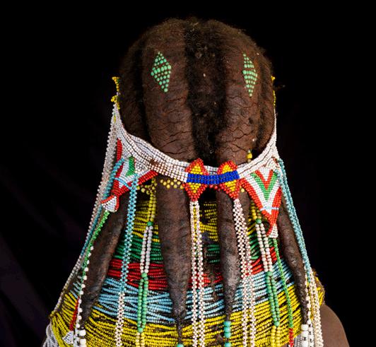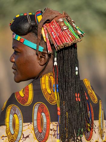 Hairstyles are very important and meaningful in Mwila culture. Women coat their hair with a red paste called, oncula, which is made of crushed red stone. They also put a mix of oil, crushed tree bark, dried cow dung and herbs on their hair. Besides this, they decorate their hairstyle with beads, cauri shells, buttons, and even dried food or feathers. In addition to beading their hair, they wear heaving bead work around their