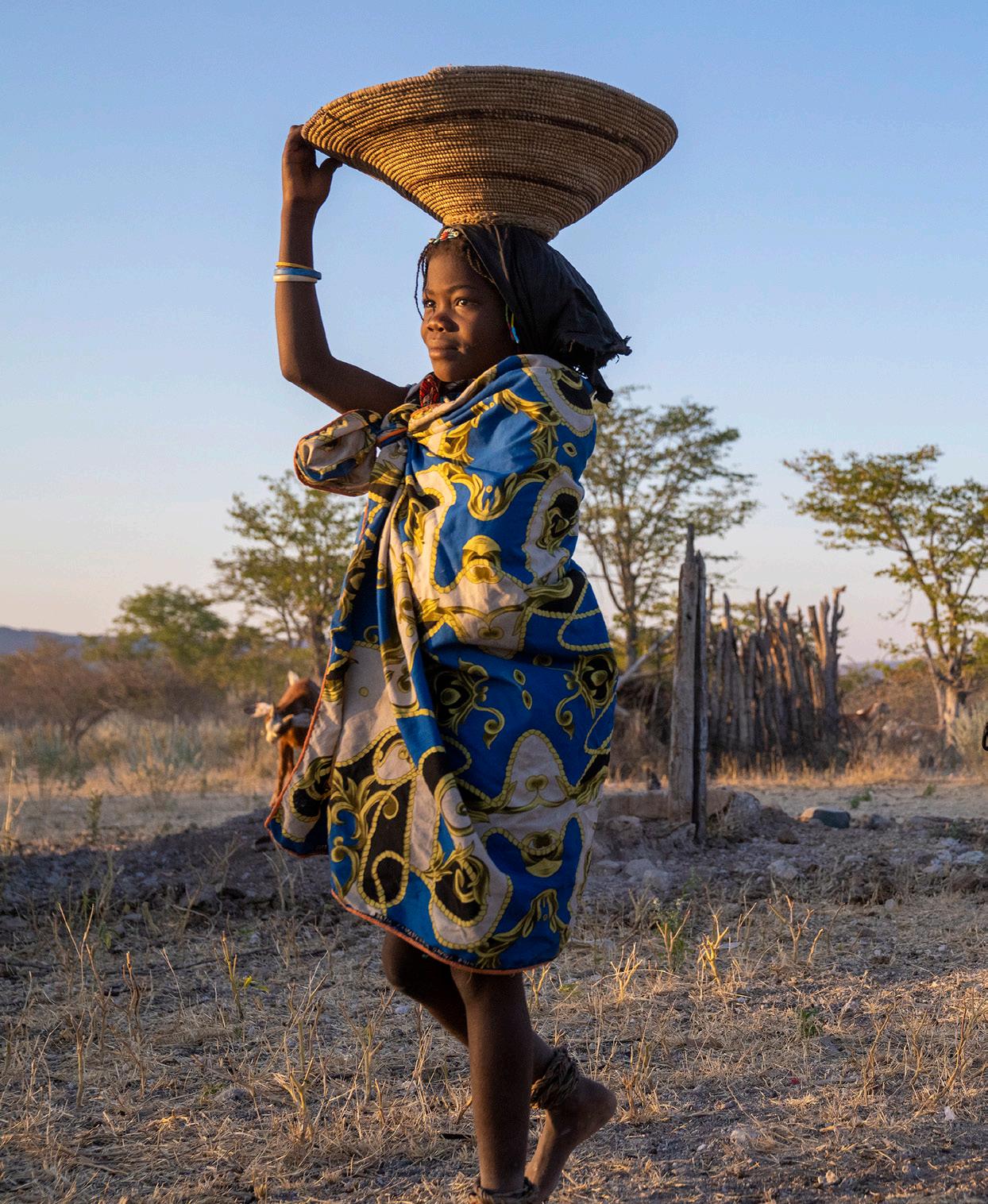 determines the importance and status of the individual person. The jewelry of married woman is a main necklace that has a shell or cone shell, which symbolizes marriage and is strung with iron and ostrich egg beads. Their ankles are covered with iron bracelets. On their head they wear an ornate headpiece called the Erembe, which resembles cattle horns. Their wrists are banded with coils of iron and plastic etched bands. Their hair is braided with mixture of animal hair, cow dung and ochre. Unmarried men wear a simple braid toward the back of their heads. Village life is simple with the young girls tending to herding and milking the goats and the women cooking a goat milk and flour or maize porridge to feed their families.