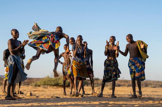 Mucubal men doing their traditional jumping dance and enjoying the party.