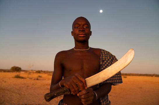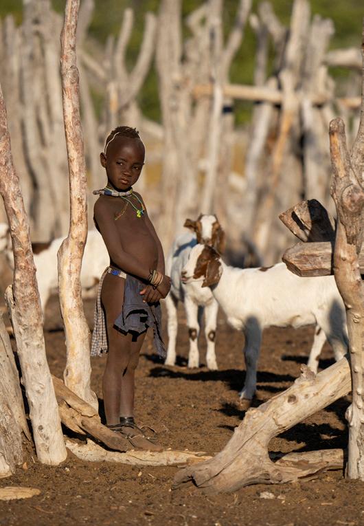 A Mucubal man displays his machete with the moon rising behind him. A young Himba girl tending goats in the village kraal.