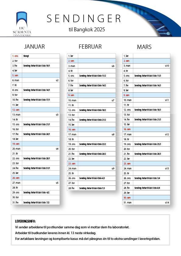 LEVERINGSINFO: Vi sender arbeidene til postkunder samme dag som vi mottar dem fra laboratoriet. Arbeider til budkunder leveres innen kl. 13 neste virkedag. For avtakbare løsninger og kompliserte kasus må det påregnes én til to ekstra sendinger i leveringstiden.