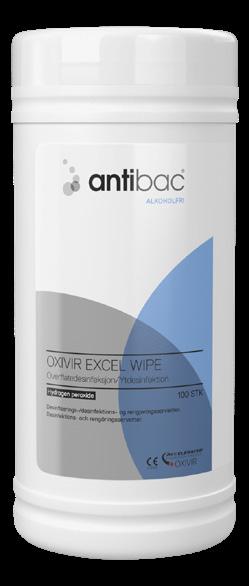 Antibac Oxivir Excel, våtservietter basert på hydrogenperoksid som brukes til daglig desinfisering av overflater, inventar og utstyr for å unngå smittespredning. Effektiv mot bakterier, gjærsopp og alle virus.