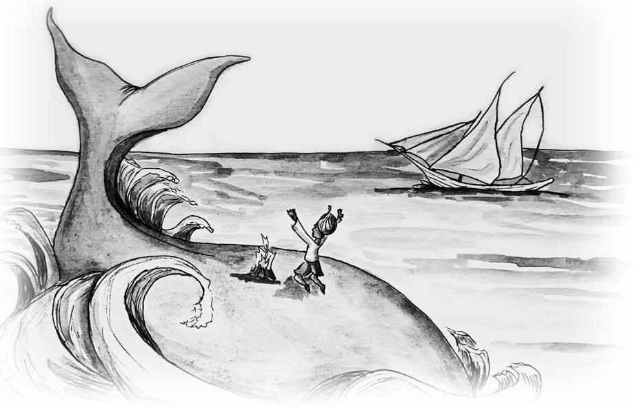 dali depressa e gritavam, muito aflitos: «Baleia12! Baleia!» Afinal, aquilo que julgávamos ser uma ilha era, nada mais nada menos13, do que as costas de uma baleia gigante. Os meus companheiros saltaram logo para a água e nadaram para o barco. Mas eu não tive a mesma sorte. A baleia mergulhou e eu, de repente, vi-me debaixo de água. Quase me ia afogando14 . Felizmente, no meio da agitação15 das águas, vi dois pedaços de madeira. Era a lenha da fogueira que andava ali a rodar16 num turbilhão17. Consegui agarrar-me a esses pedaços de madeira e vir à superfície. Já com a cabeça fora de água, vi o barco a afastar-se.
