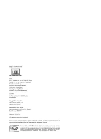 SEDE Rua D. Estefânia, 183, r/c Dto. – 1049-057 Lisboa Tel: +351 213 511 448 * Fax: +351 213 522 684 Revenda: revenda@lidel.pt Exportação: depinternational@lidel.pt Venda online: livraria@lidel.pt Marketing: marketing@lidel.pt Projetos de Edição: edicoesple@lidel.pt LIVRARIA Av. Praia da Vitória, 14 – 1000-247 Lisboa livraria@lidel.pt Copyright © novembro 2014 Lidel – Edições Técnicas, Lda. ISBN: 978-989-752-092-1 Pré-Impressão: Carlos Mendes Impressão e acabamento: Grafo, S.A. – Espanha Depósito Legal: 380519/14 Capa: José Manuel Reis Livro segundo o novo Acordo Ortográfico Todos os nossos livros passam por um rigoroso controlo de qualidade, no entanto, aconselhamos a consulta periódica do nosso site (www.lidel.pt) para fazer o download de eventuais correções. Reservados todos os direitos. Esta publicação não pode ser reproduzida, nem transmitida, no todo ou em parte, por qualquer processo eletrónico, mecânico, fotocópia, digitalização, gravação, sistema de armazenamento e disponibilização de informação, sítio Web, blogue ou outros, sem prévia autorização escrita da Editora, exceto o permitido pelo CDADC, em termos de cópia privada pela AGECOP – Associação para a Gestão da Cópia Privada, através do pagamento das respetivas taxas.