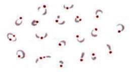 • Trofozoítos: habitualmente numerosos, de tamanho pequeno a médio, com citoplas ma homogéneo em forma de vírgula ou crescente, alguns em anel, com presença de muitas formas com dois pontos de croma tina (núcleos redondos, alongados ou com formas irregulares). Os trofozoítos maduros apresentam citoplasma compacto com grâ nulos grosseiros escassos ou massa única de pigmento malárico (Figura 11.4);