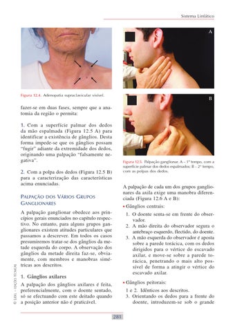 fazer-se em duas fases, sempre que a anatomia da região o permita: 1. Com a superfície palmar dos dedos da mão espalmada (Figura 12.5 A) para identificar a existência de gânglios. Desta forma impede-se que os gânglios possam “fugir” adiante da extremidade dos dedos, originando uma palpação “falsamente negativa”.