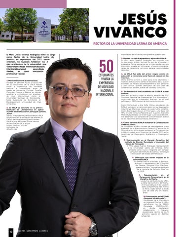 JESÚS VIVANCO RECTOR DE LA UNIVERSIDAD LATINA DE AMÉRICA El Mtro. Jesús Vivanco Rodríguez tomó su cargo como Rector de la Universidad Latina de América en septiembre del 2021, desde entonces, ha buscado fortalecer los 4 ejes académicos de la universidad, que comprenden desde internacionalización, interdisciplinariedad, aprendizaje flexible, así como vinculación profesional y social. 1. Movilidad nacional e internacional. Durante los periodos P2022 y O2022 más de 50 estudiantes de la UNLA habrán vivido la experiencia de movilidad nacional e internacional, entre los países se encuentra Portugal, España, Colombia, Francia y Bélgica, en donde acudirán a instituciones con prestigio de nivel internacional, como la Universidad Santiago de Compostela, École Superieure de Commerce et Développement, Universidad de Vigo, entre otras. 2. La UNLA se convierte en la primera Institución de Latinoamérica en aplicar examen de certificación en portugués Camões Júnior. Siendo 18 estudiantes del bachillerato UNLA los pioneros en la realización del examen. El Centro de Lengua Portuguesa CamõesUNLA es uno de los dos únicos centros de certificación de la lengua lusa en México y uno de los lugares de difusión más