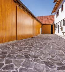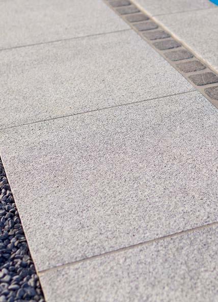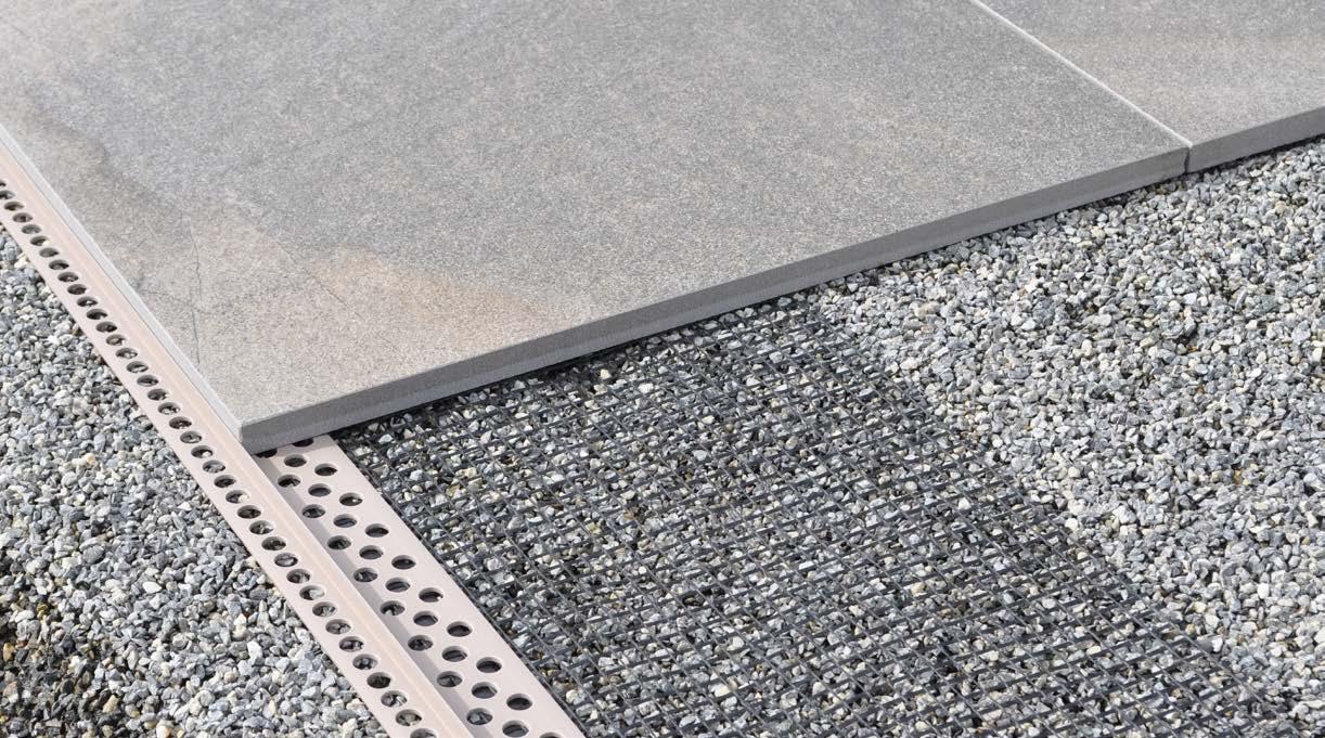 Abschluss bei Terrassen und Traufen Bei Terrassen- oder Traufenflächen, die auf monolithischen wasserundurchlässigen Betonflächen gepflastert werden, ist unbe dingt auf eine fachgerechte Wasserablei tung der zweiten Entwässerungsebene zu achten. Es ist eine entsprechende Drainage im Randbereich mit einer Randbegrenzung und einem drainagefähigen Material auszuführen. Damit wird verhindert, dass es zu Staunässe in diesem Bereich kommt und auch der Humus ist von der Boden konstruktion getrennt. Bei Terrassen- oder Traufenflächen auf Drainbeton, ist ein Randabschluss vorzusehen, um Humus und Pflasterkonstruktion voneinander ab zugrenzen und zu trennen.