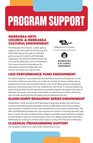 PERFORMANCE INFO ARRIVING FOR A PERFORMANCE Performance times vary. Please check your ticket or call 402.472.4747 to confirm starting times. Ushers will seat latecomers at an appropriate time to minimize disruption. Each person attending a performance at the Lied Center, regardless of age, must have a ticket. For ticket information, call 402.472.4747 or 800.432.3231 toll-free. TICKET OFFICE HOURS Monday – Friday: 11:00 AM – 5:30 PM For weekday performances: 11:00 AM – ½ hour after the start of show For weekend performances: Open at Noon for matinees; 5:00 PM for evening shows For Johnny Carson Theater, Kimball Hall and all other venues: Open 1 hour prior to performance PARKING Because of the volume of events downtown, parking is sometimes at a premium. Please allow sufficient time for parking. For parking options, visit parkandgo.org. Valet parking is also provided for many performances. SPECIAL ACCOMMODATIONS Special seating for individuals with disabilities is available upon request. Assisted listening devices are available at coat check at no charge. Patrons are asked to leave an I.D. when checking out a device. Sign interpreters are available but must be requested two weeks in advance. Large print programs available upon request. We are committed to accommodating patrons with disabilities; however, we cannot provide personal care attendants. Patrons must bring their own personal care attendant to provide for needs should the occasion arise. The Lied Center provides seating in the observation room if a patron must leave the theater during a performance.