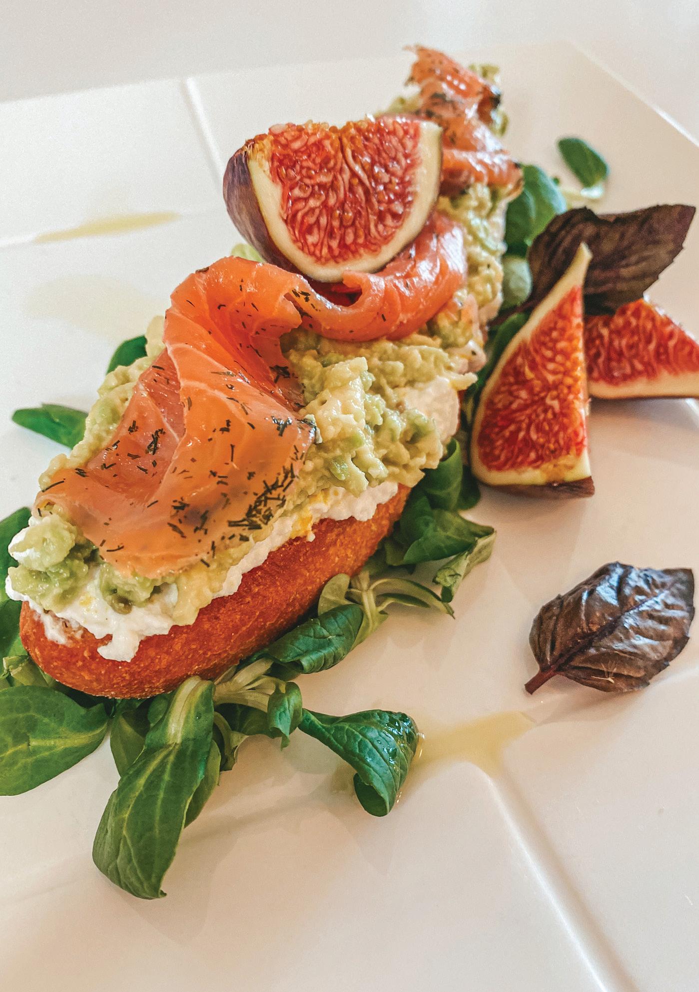 Ant kiekvienos čiabatos puselės tepkite rikotos ir avokado masės, dėkite lašišos, apibarstykite smulkintais krapais. Patiekite su sultenėmis ir figos skiltelėmis.