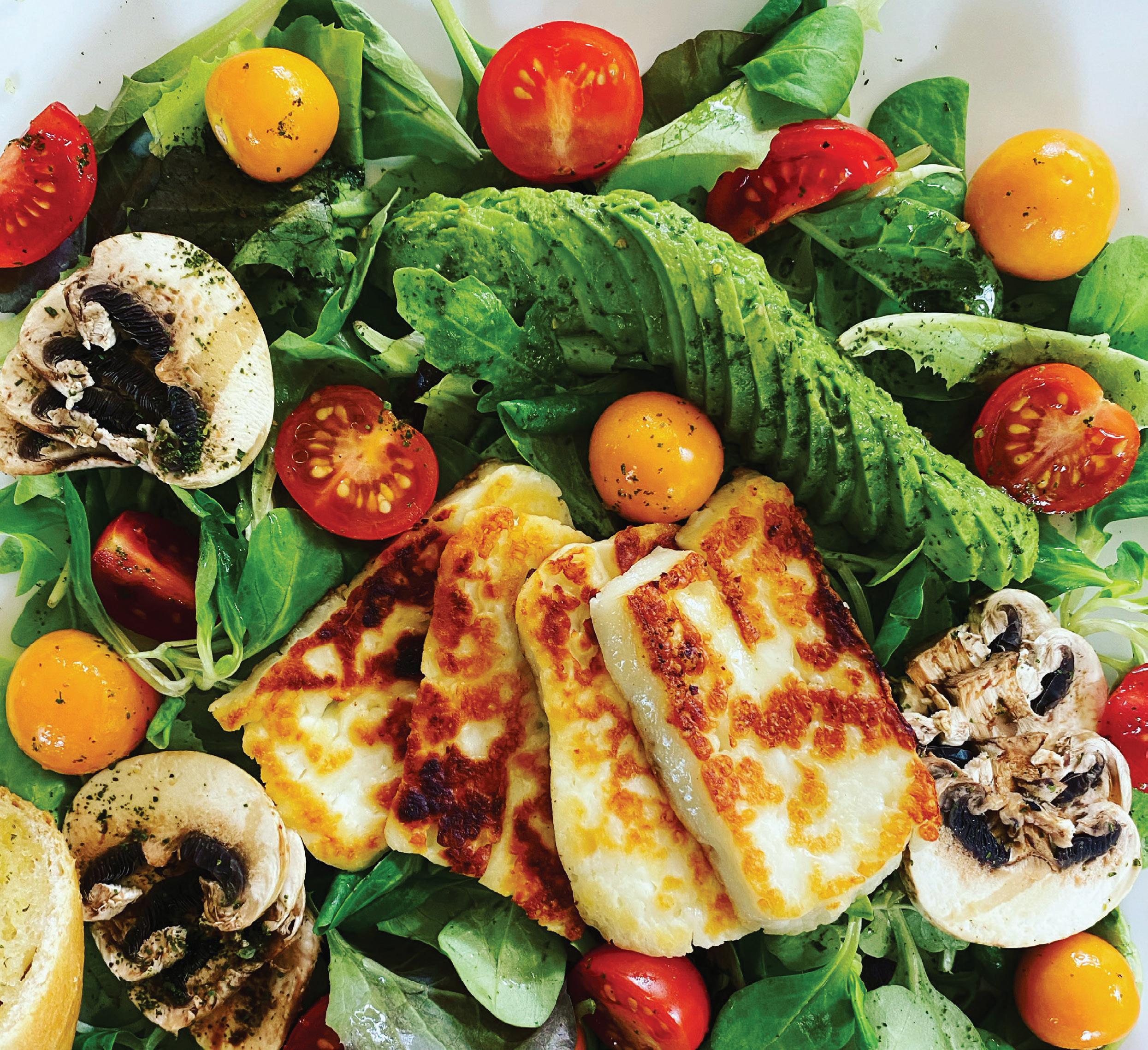 Keptuvėje su šlakeliu aliejaus pakepinkite sūrį. Supjaustykite avokadą, pievagrybius, pomidoriukus. Lėkštėje išdėliokite ingredientus, apšlakstykite alyvuogių aliejumi ir citrinų sultimis, paskaninkite persiladu. Patiekite su paskrudintu prancūzišku batonu.