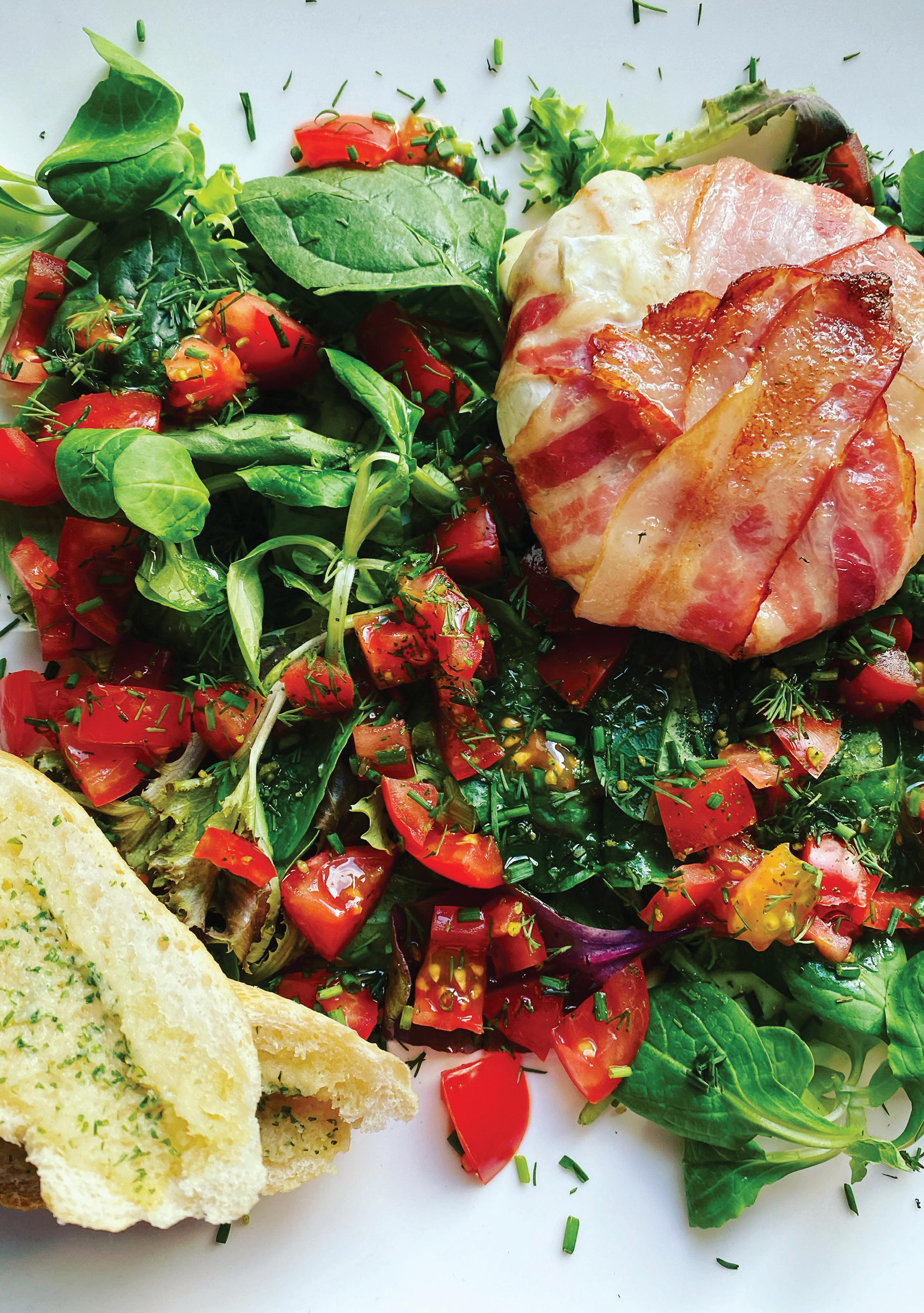 Sūrį apvyniokite šoninės juostelėmis ir kepkite iki 180 °C įkaitintoje orkaitėje, kol šoninė gražiai apskrus. Kartu orkaitėje paskrudinkite prancūzišką batoną.