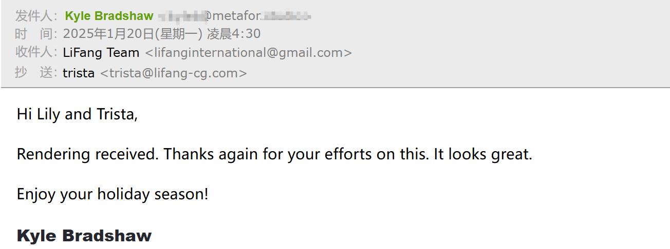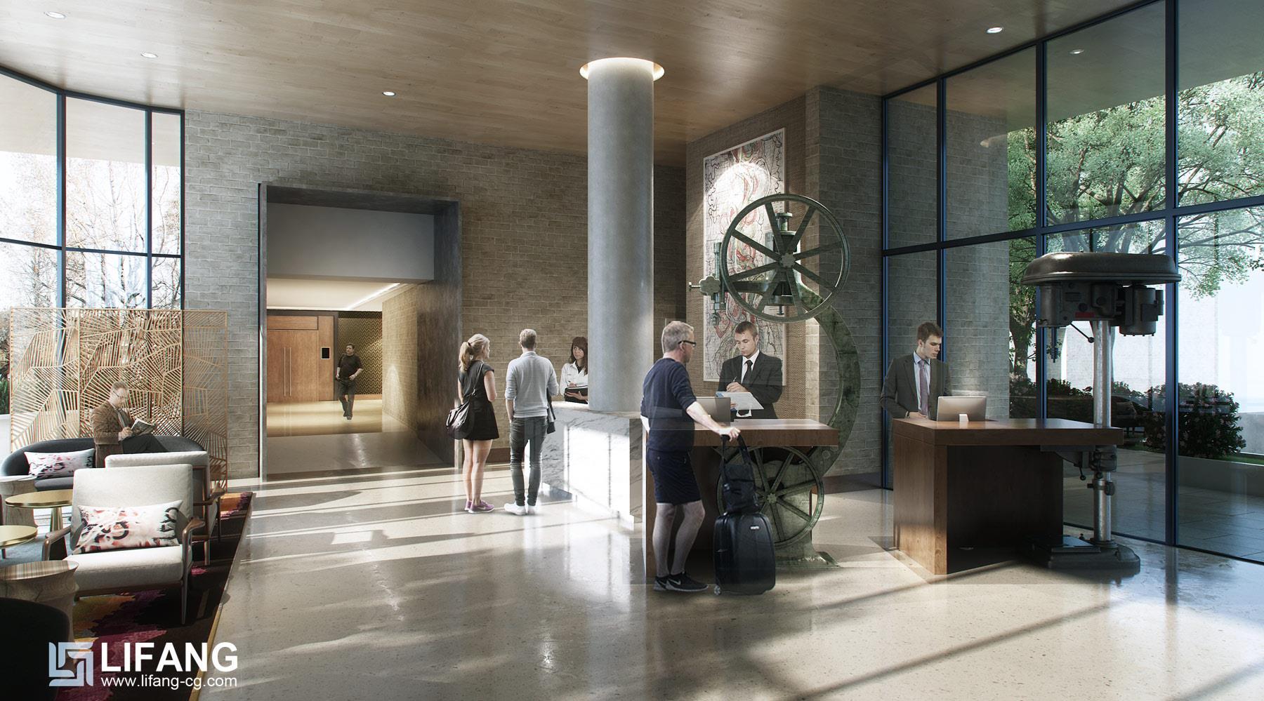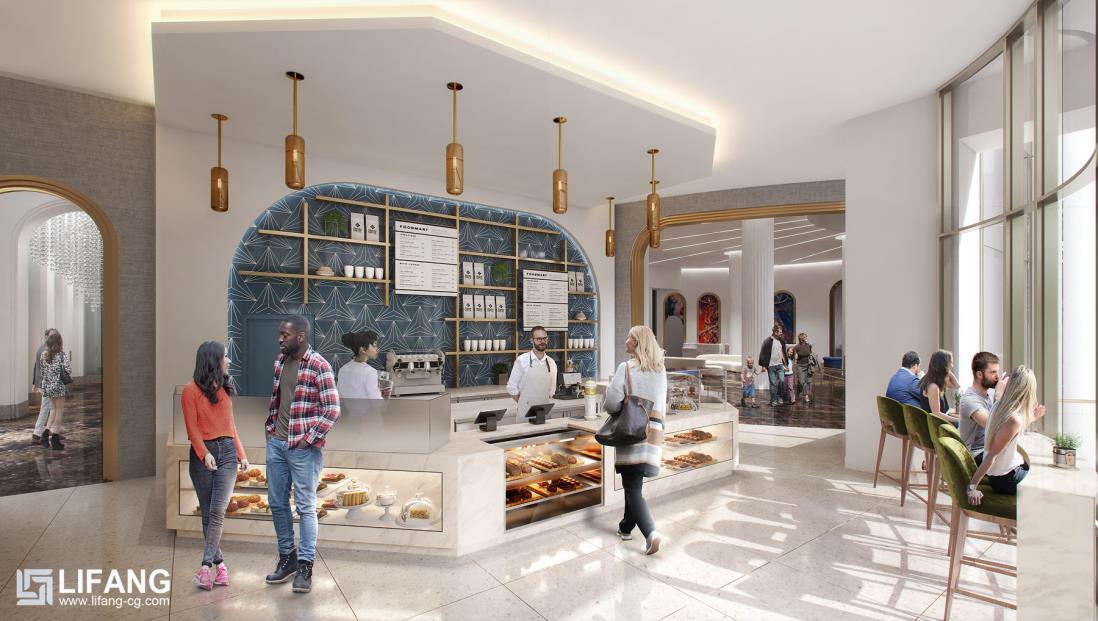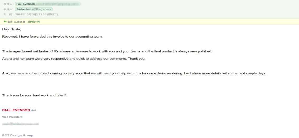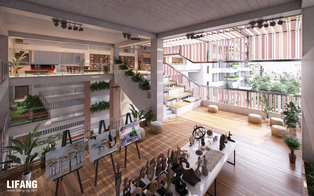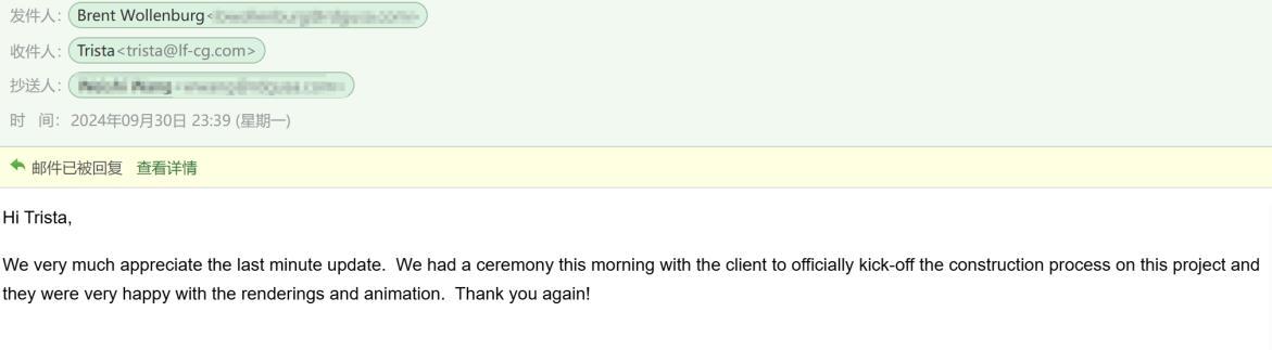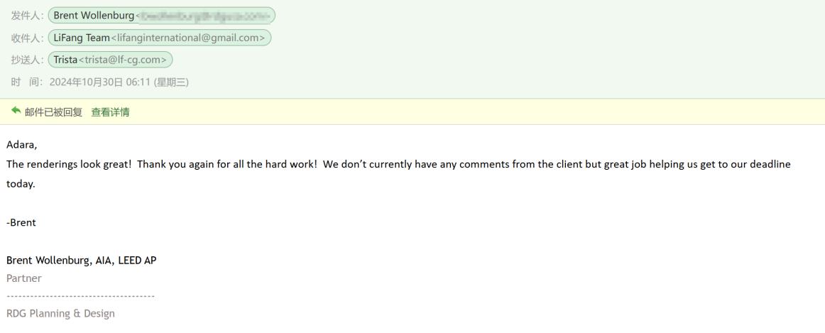 Rendering drafts are sent to confirm the lighting, texture, colors, shadow, people, green plants etc.
