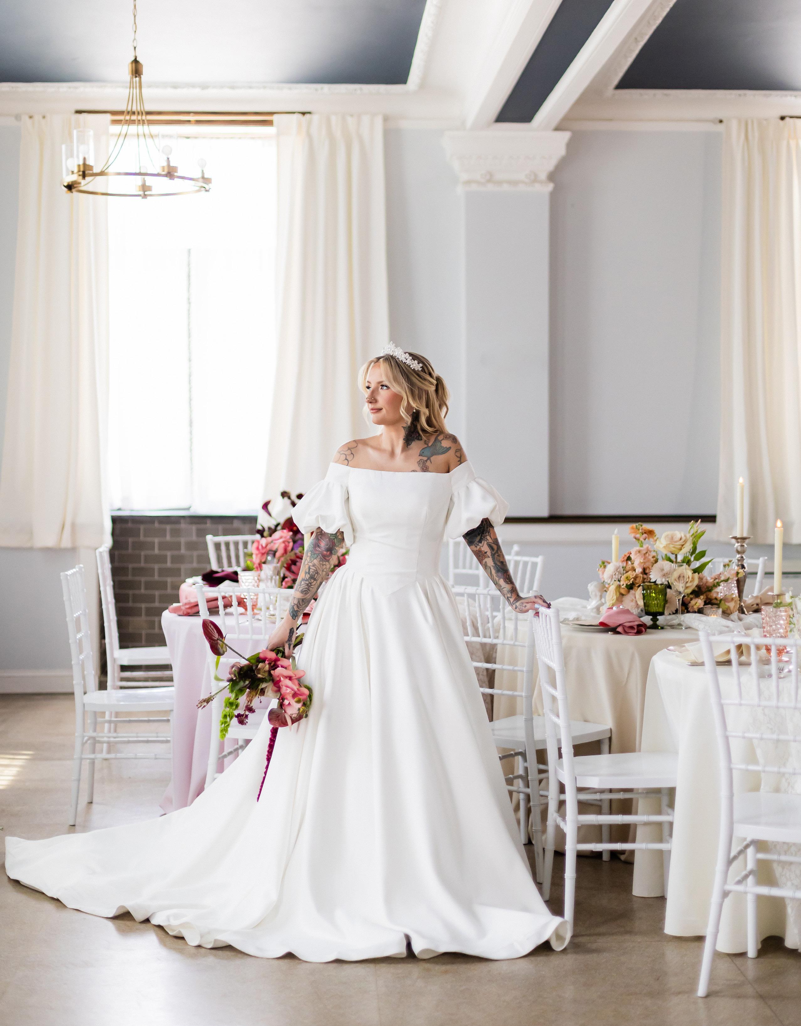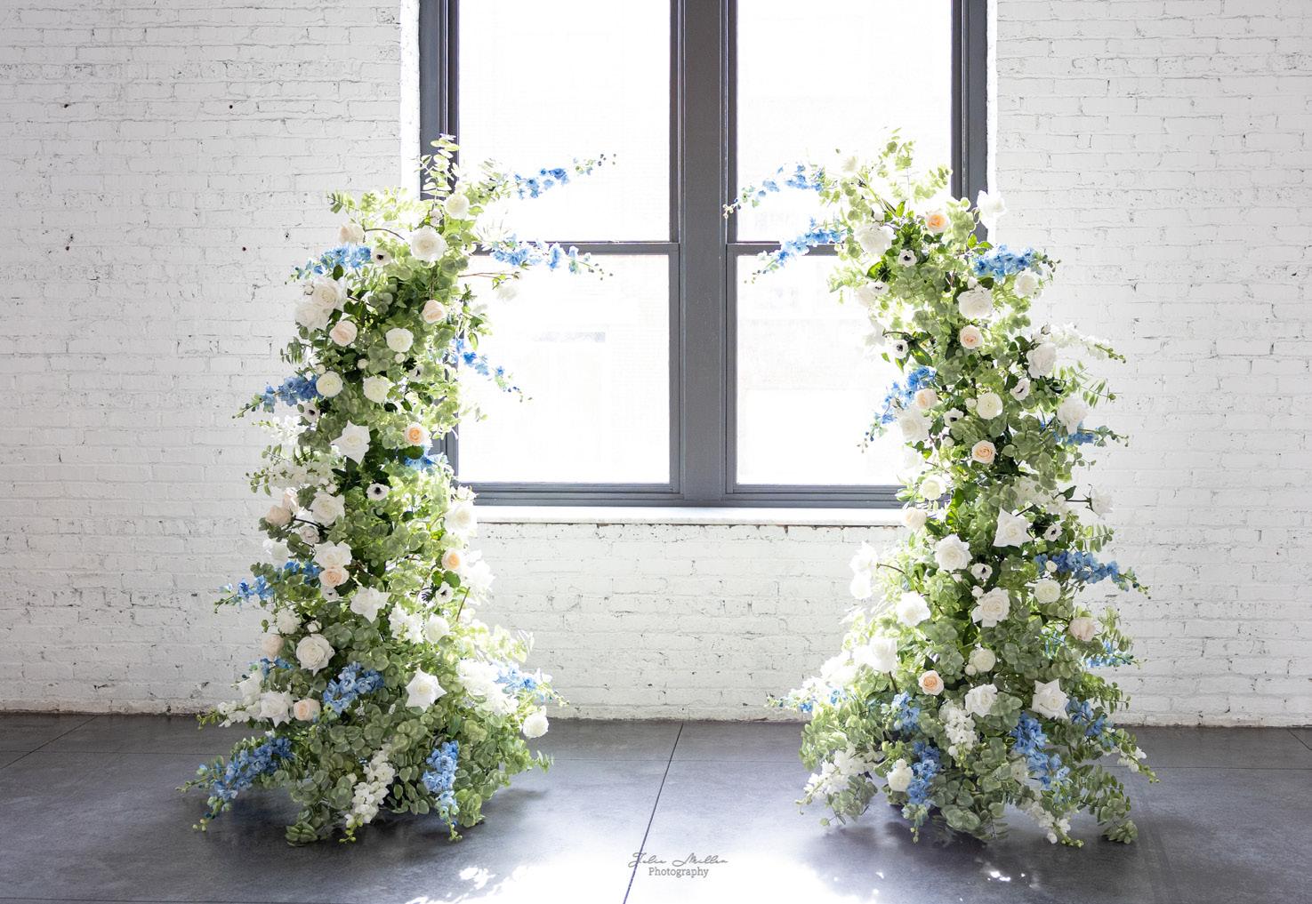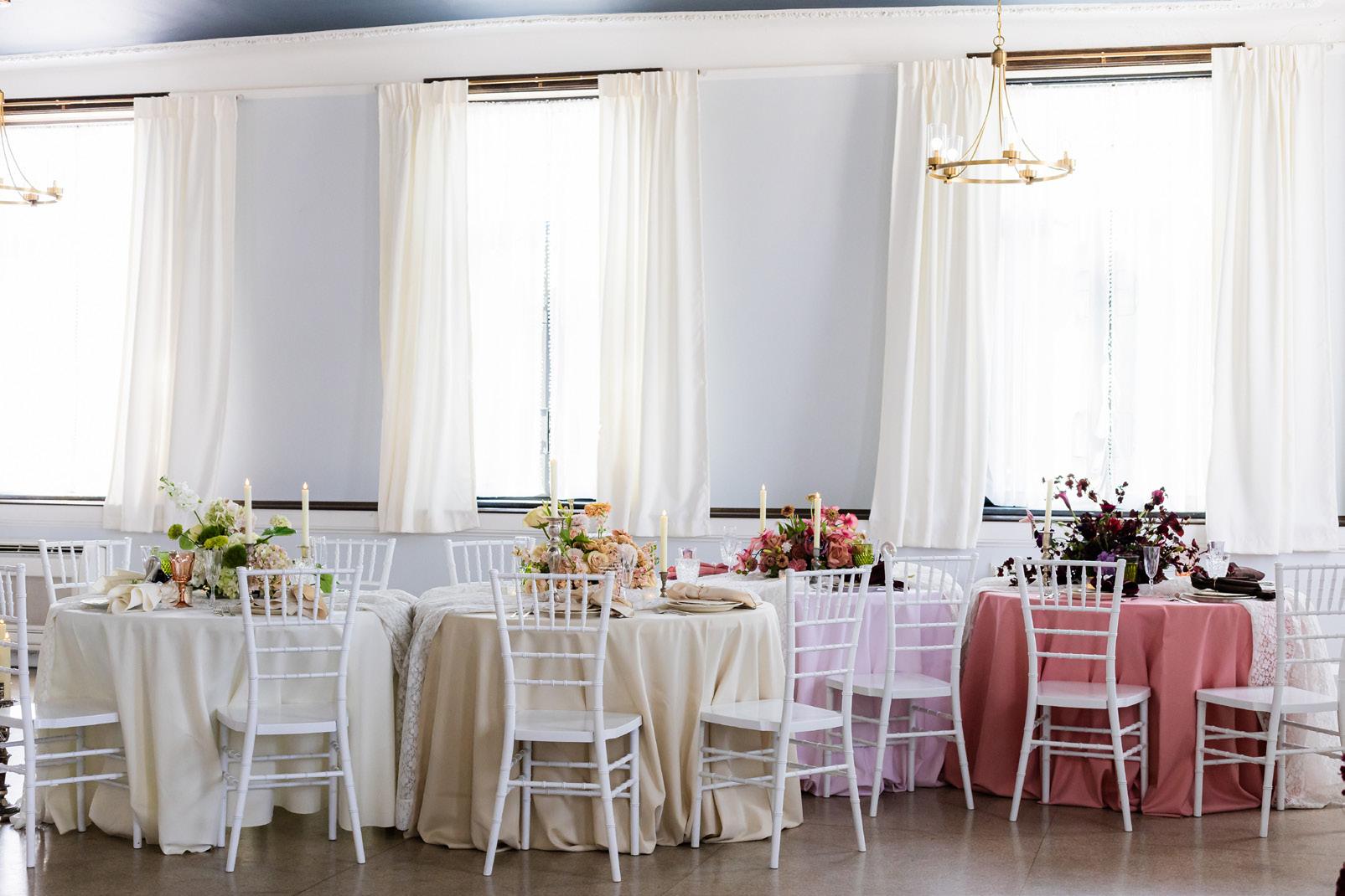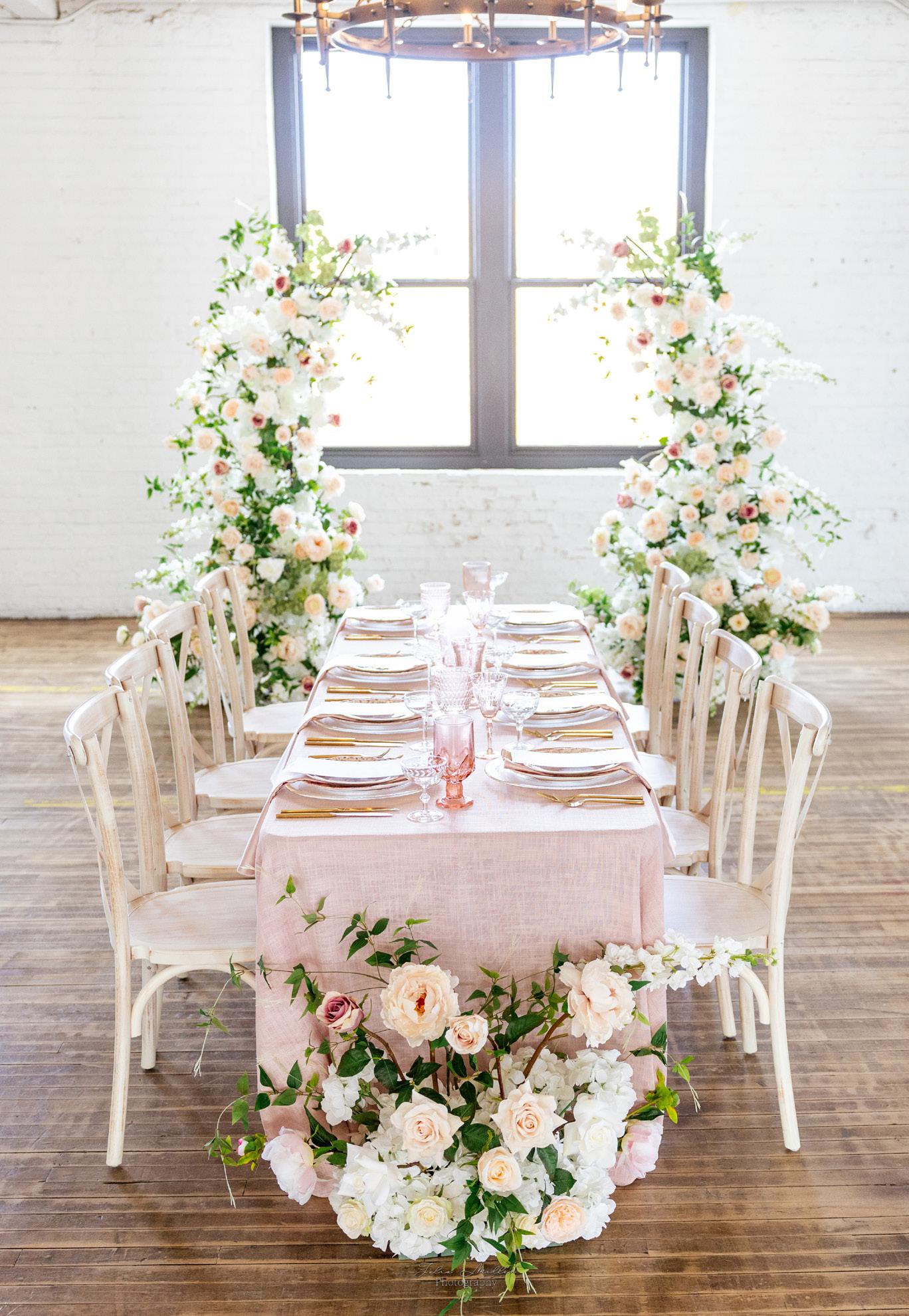 Two distinct ideas were incorporated into this style shoot. One was to emulate a French countryside with baby blues and plenty of florals, and the other was to create a romantic garden setting with beautiful blush tones. The blank slate of the venue and clean white walls allowed the team to seamlessly bring both ideas to life and let the colors shine! Both setups turned something simple into a decadent and extravagant wedding scene. The use of glassware and elegant place settings make this reception feel like a high society dinner. And we adore the way the pink plates and all stationery pieces give a nod to the florals!