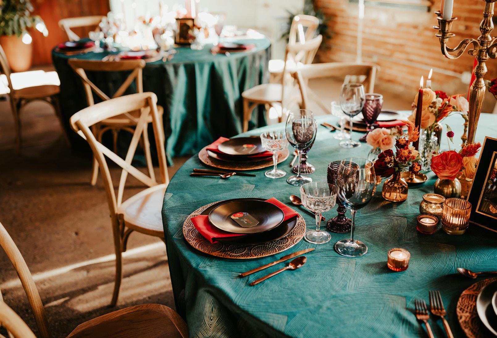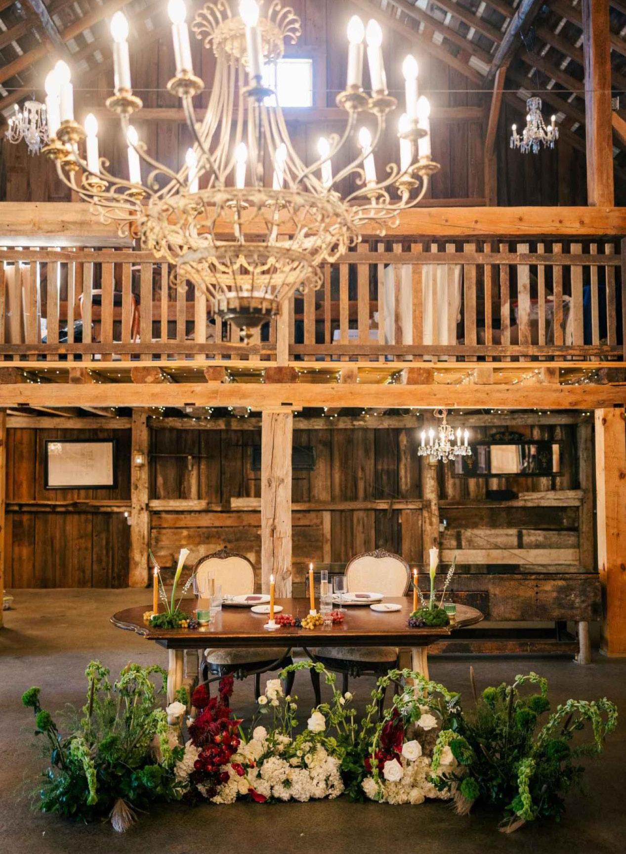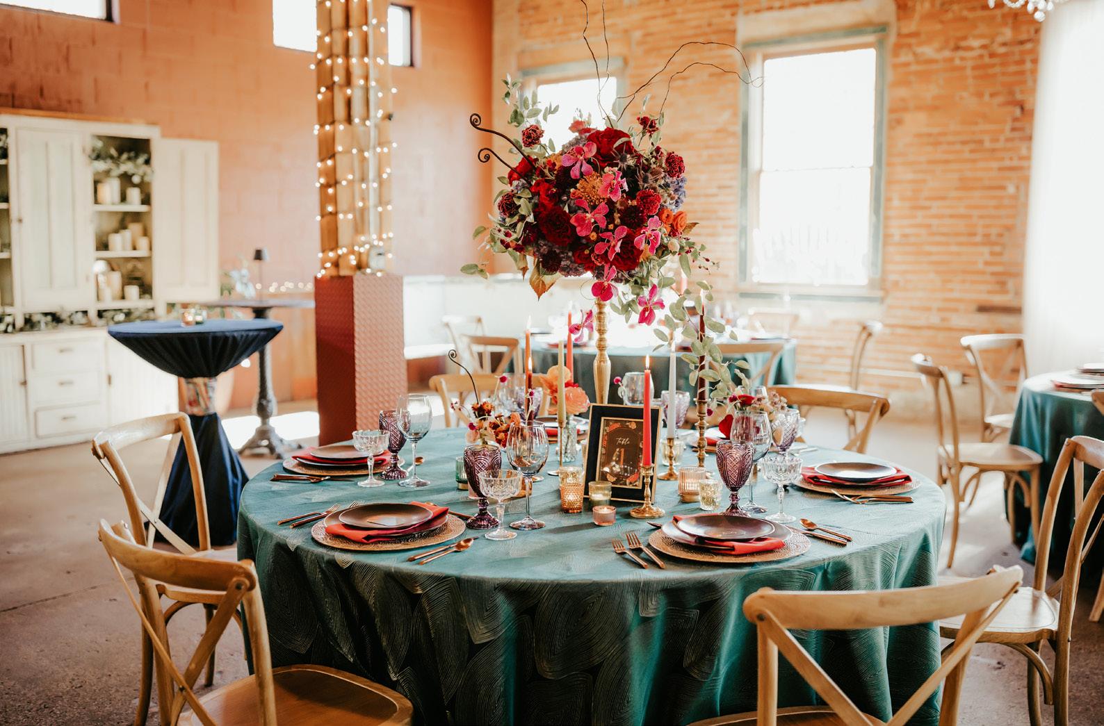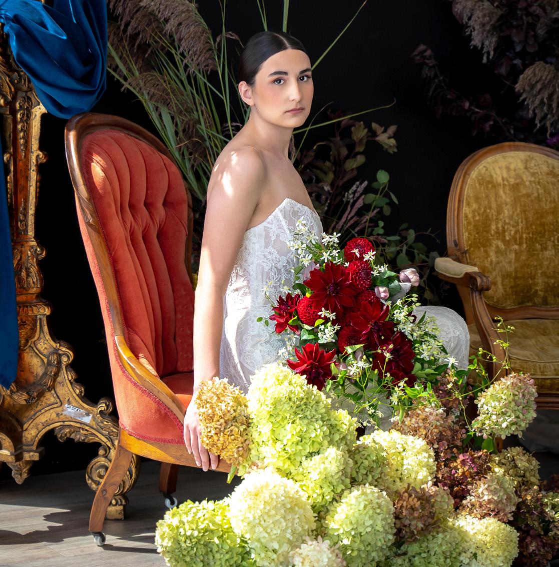 If Old Masters’ paintings met modern sculpture, this would be the result. Kris Livovich of Sugarfield Flowers, the florist and coordinator behind this shoot, dreamed in texture, drama and rich, romantic color. Her concept blends classic romance—think lace sleeves, candlelight and moody lighting—with a bold, modern twist. Captured beautifully by Trysh Jaeger Photography, the editorial showcases deep reds, mocha tones, soft golds and plenty of mood!