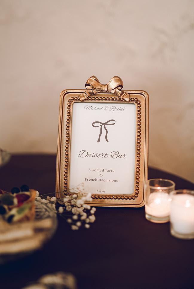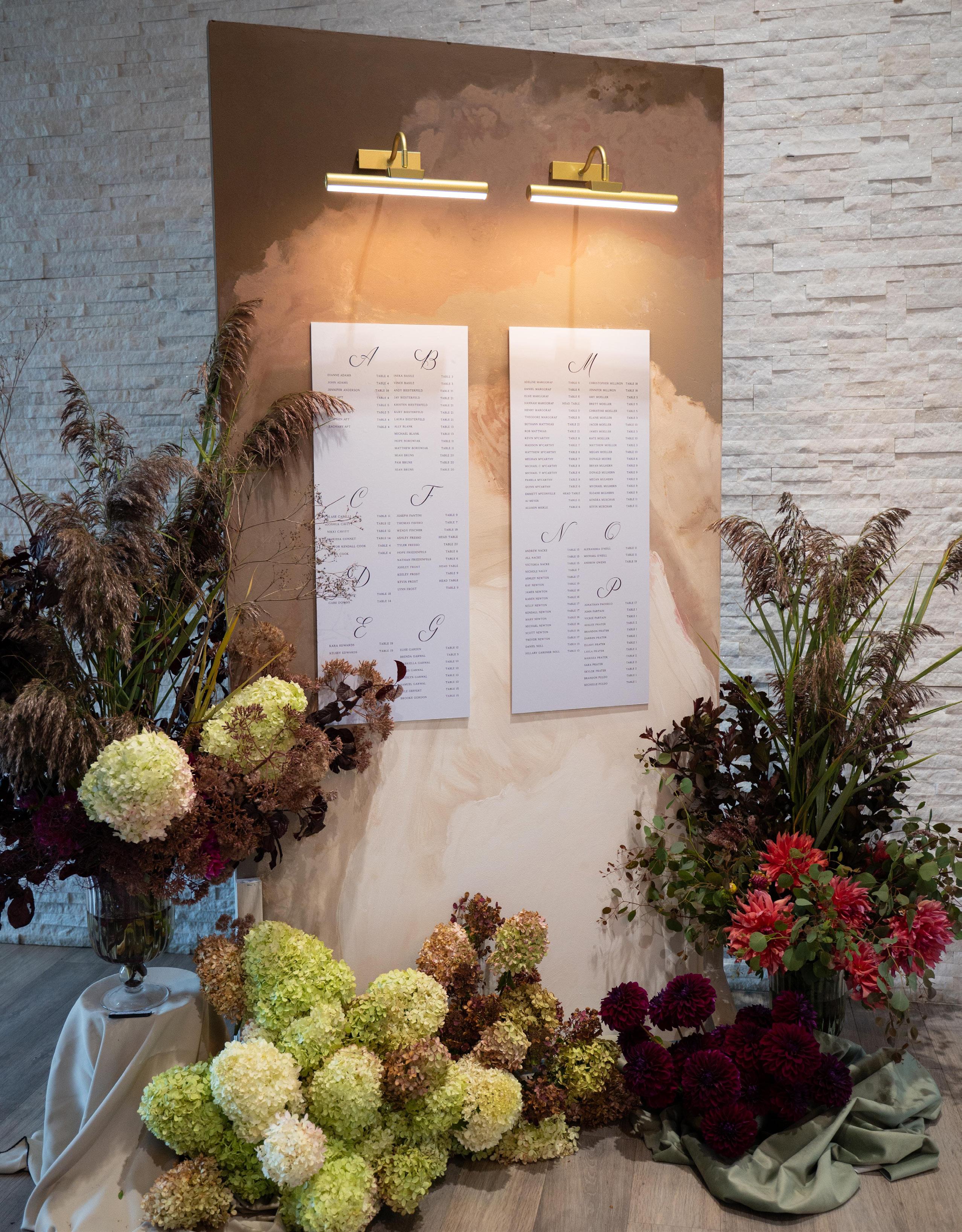 Allure on the Lake might as well have been made for this concept! Its mix of rustic charm (hello, exposed brick!) and modern polish gave the team the perfect blank canvas to allow their décor to shine. Utilizing velvet, candles, candelabras and just a hint of drama, this setup was designed to make hearts flutter! AAYS Event Rentals brought in serious luxury with velvet linens, mocha dinner plates and gold flatware. We're also obsessed with the jawdropping custom seating chart and flowing drapery used in the ceremony space. "Every element, from the stationery by Andrea Rochelle Art to the curated furniture for the portrait station by Spare Room Studios, was selected to tell a coherent story: that the beauty of tradition is eternal, but that love, like art, must always evolve," Trysh explains.