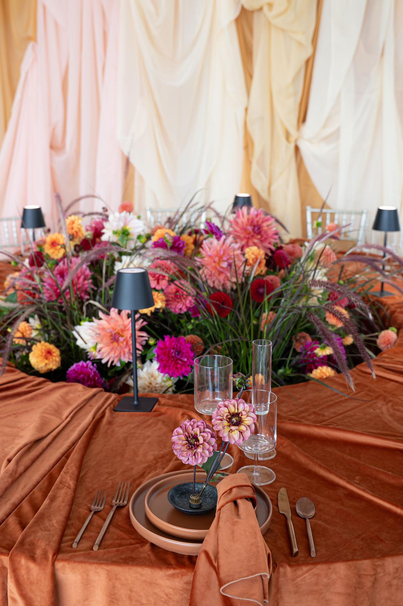 We love all the color in this shoot! The blue setup was a little more simple and classic while the pink scene was more vibrant and fun. To say we are obsessed with the pink suit is an understatement! It’s such a bright and unique way to incorporate more color into the day while still keeping it elegant and refined.