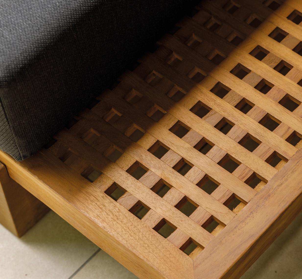 Met strakke lijnen en ambachtelijke details, zoals het rasterwerk in de plateaus, biedt de Morena een verfijnde maar stoere look. Deze eyecatcher valt op door de unieke materialen en afwerkingen en kan worden uitgebreid met een bijpassende vuurtafel voor extra sfeer en warmte in de tuin.