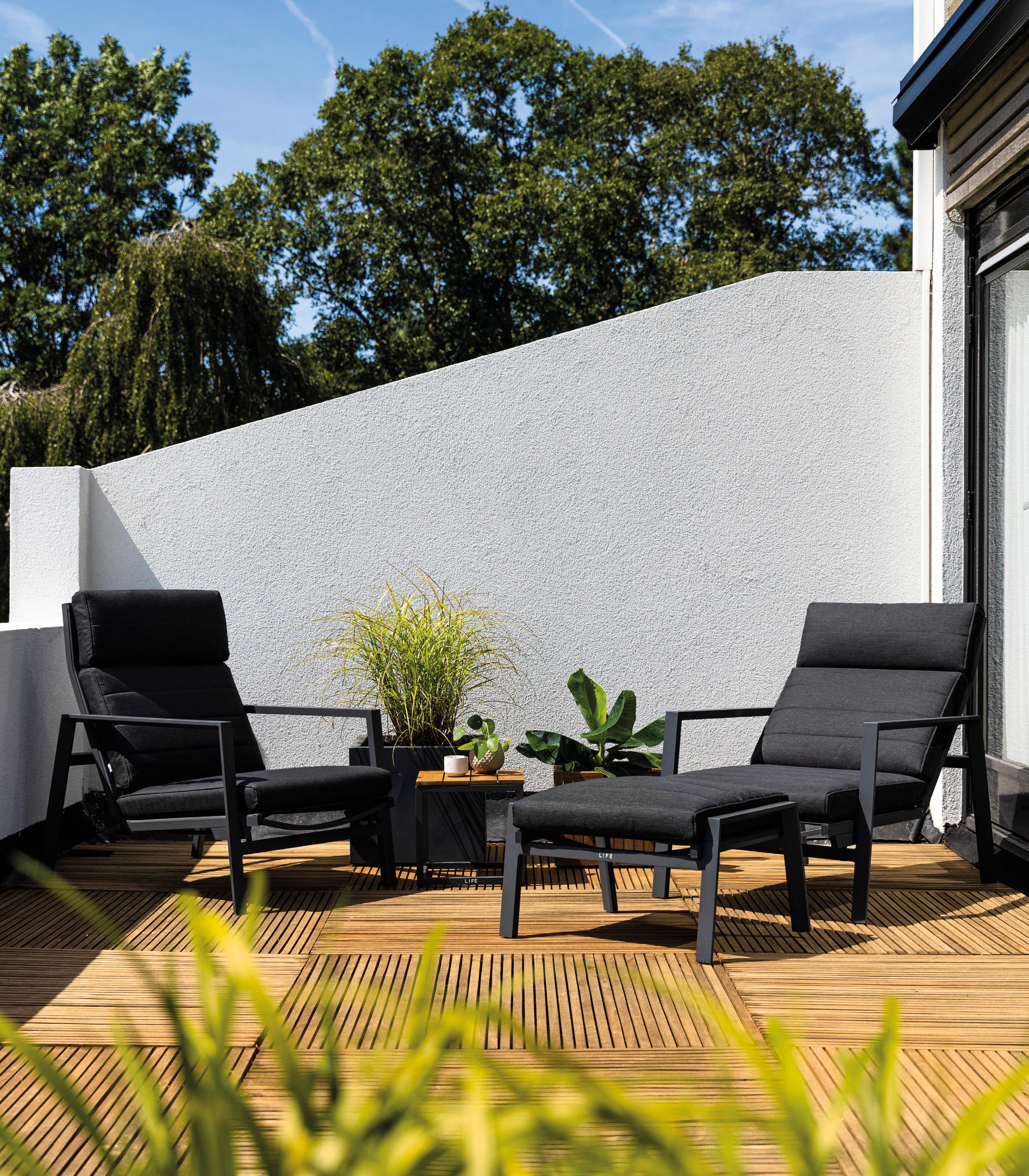For a small garden or balcony, making smart use of space is key. Choosing elongated tiles and a lightcoloured backdrop creates depth. Multifunctional furniture is ideal: a lounge set with All-weather cushions and a height-adjustable table combines comfort and flexibility. This way, you can dine and lounge in one set while saving storage space thanks to weatherproof cushions.