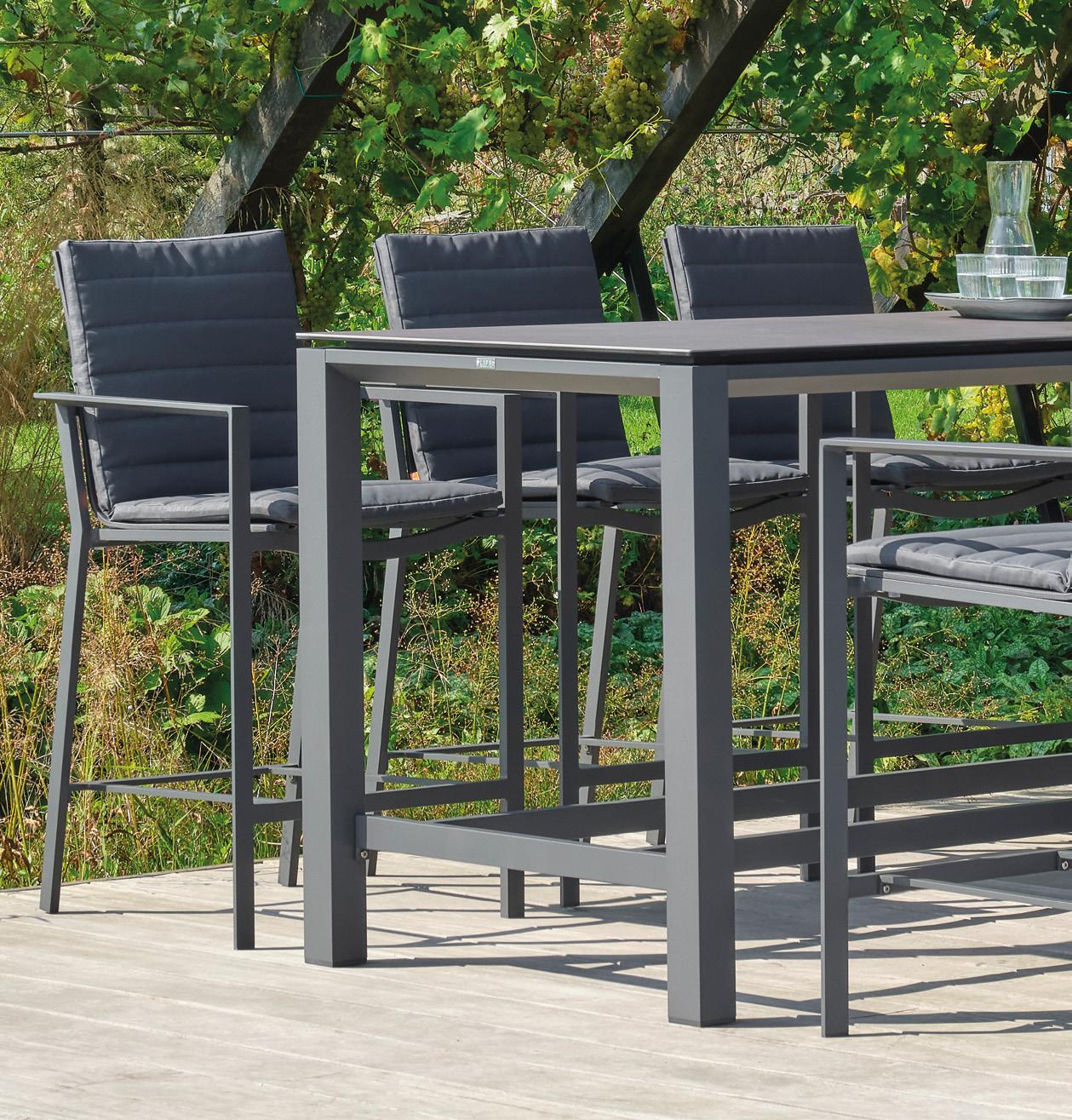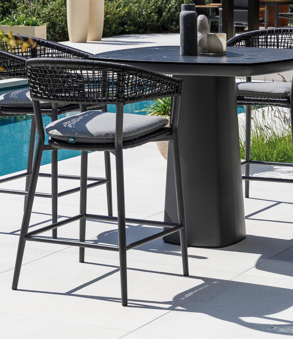 The Madeira bar table features a rounded lava column base, making a bold statement in any outdoor space. Its low-maintenance aluminium frame and ceramic tabletop strike the perfect balance between durability and sophistication, allowing you to enjoy years of style and convenience.