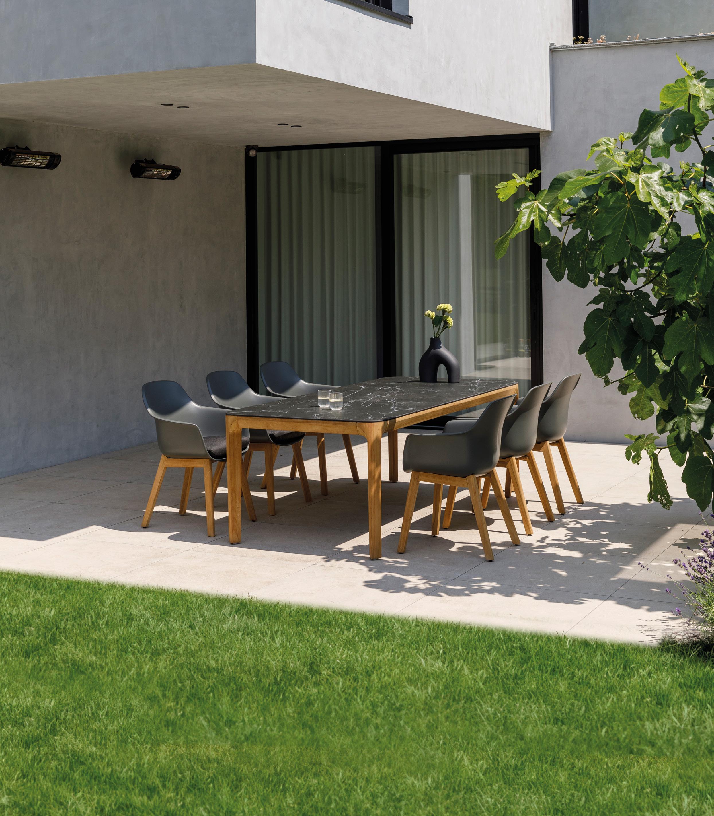 The rounded forms reflect one of the key trends he discovered at the Salone del Mobile furniture fair in Milan. With the Lazio table, Taco brings the best of interior design to the outdoors. Its innovative stonex material combines the robust look of natural stone with the lightness and durability needed for everyday outdoor use.