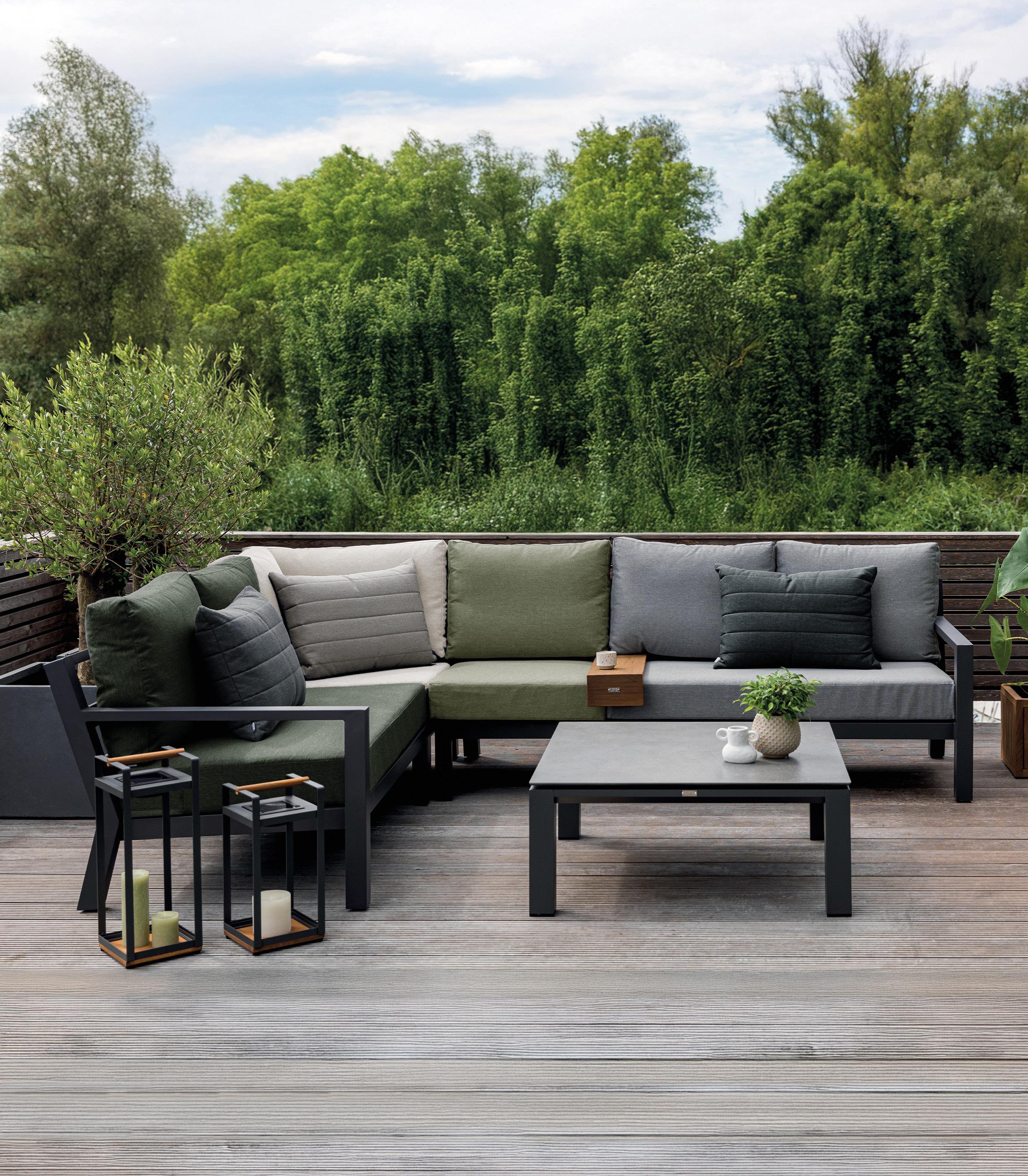 Give your garden a rugged, modern character with the industrial style. A lava coloured frame, dark cushions, and wooden elements create a striking look. Complete the setting with black, grey, or green accessories, such as a bold coffee table and large plants in sturdy pots. Perfect for those who love a contemporary, daring atmosphere.