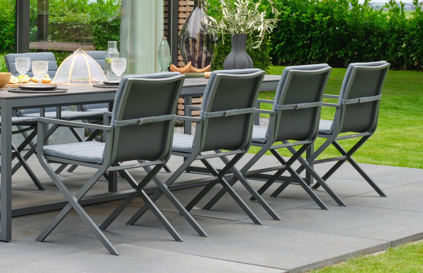 The cushion cover is made of soft-touch Textilene—a comfortable fabric with tiny pores that allow water to pass through. When water enters the polyester filling it easily drains out through the open-cell structure. As a result, the cushions dry quickly, so you can enjoy your outdoor space again soon after a rain shower. If the cushion gets wet, press down on it and place it on its side. This allows most of the water to drain out immediately, helping it dry faster.