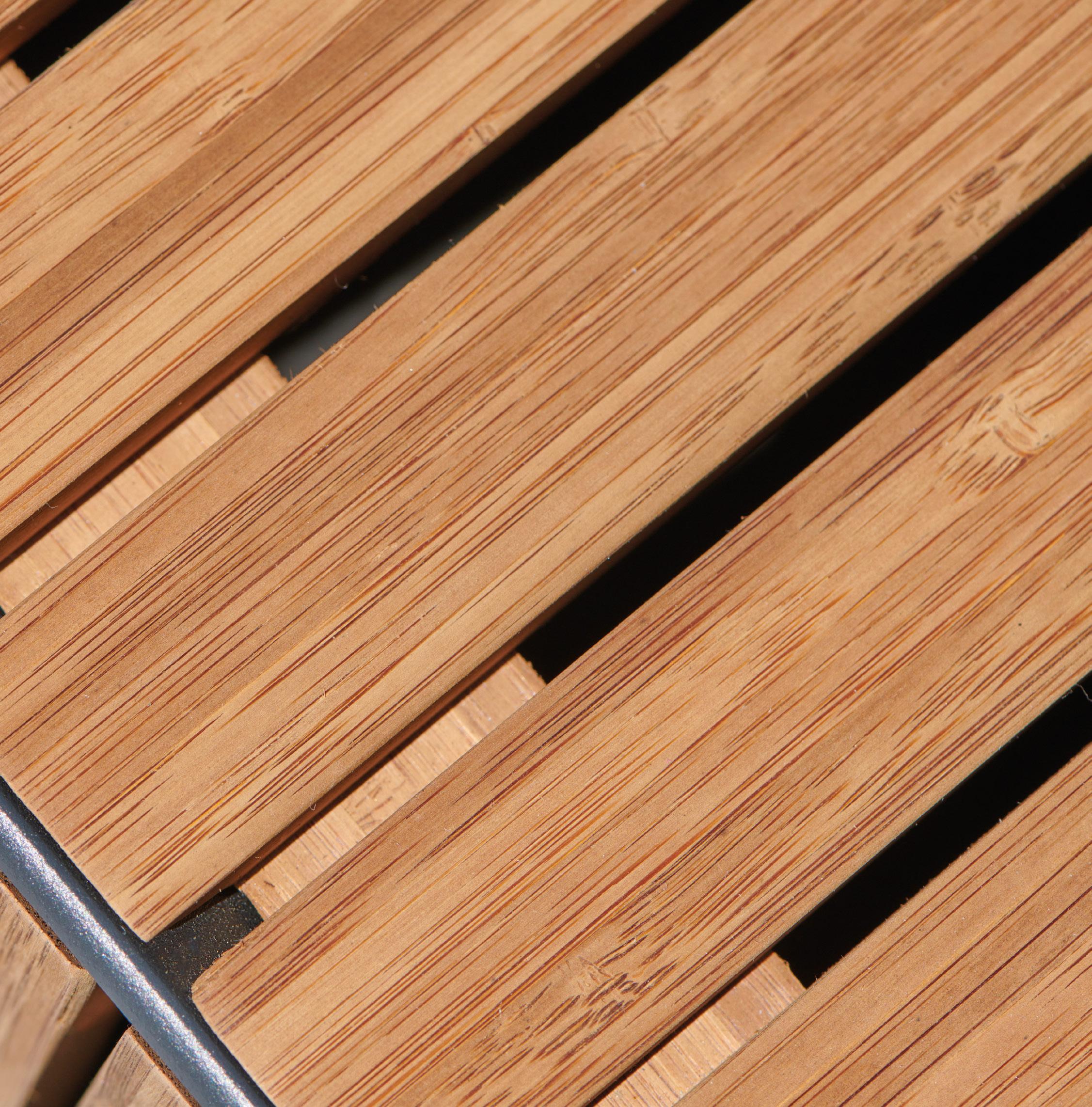 Bambus zeichnet sich durch seine natürliche, organische Optik aus, die hervorragend zu Außenbereichen passt. Es ist extrem stark und widerstandsfähig gegenüber den Elementen, was es zu einer langlebigen Wahl für Gartenmöbel macht. Im Gegensatz zu vielen Holzarten verrottet Bambus nicht schnell und ist resistent gegen Feuchtigkeit, Schimmel und Insekten. Diese Eigenschaften macht es zu einer exzellenten Option für Möbel, die unterschiedlichen Wetterbedingungen ausgesetzt sind.
