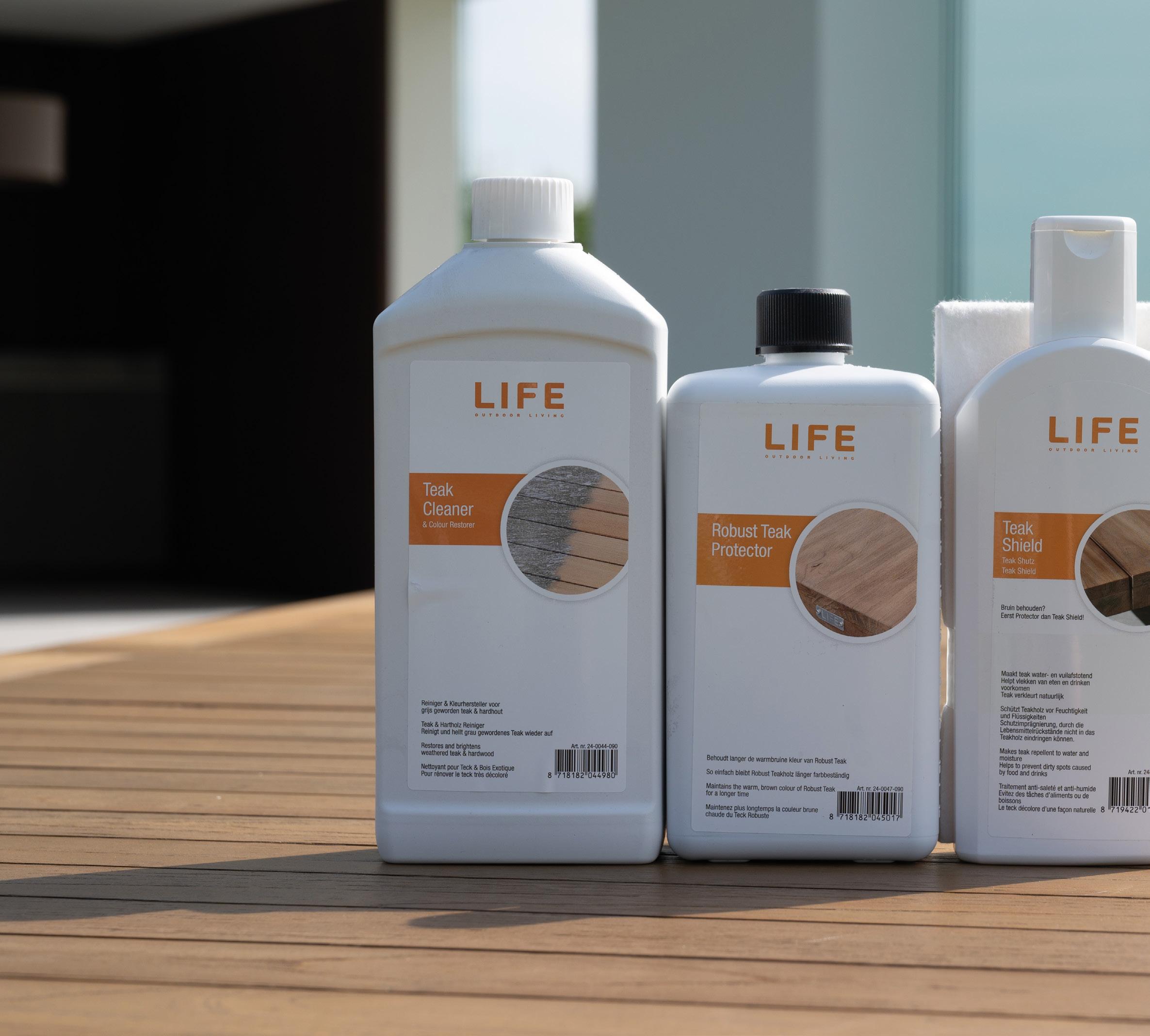 Um die natürliche Farbe des Teakholzes zu erhalten, haben wir spezielle Pflegemittel für robustes Teak, graues Teak und Naturteak entwickelt. Wenn eine Vergrauung des Holzes gewünscht ist, kann dieser Schritt übersprungen werden.