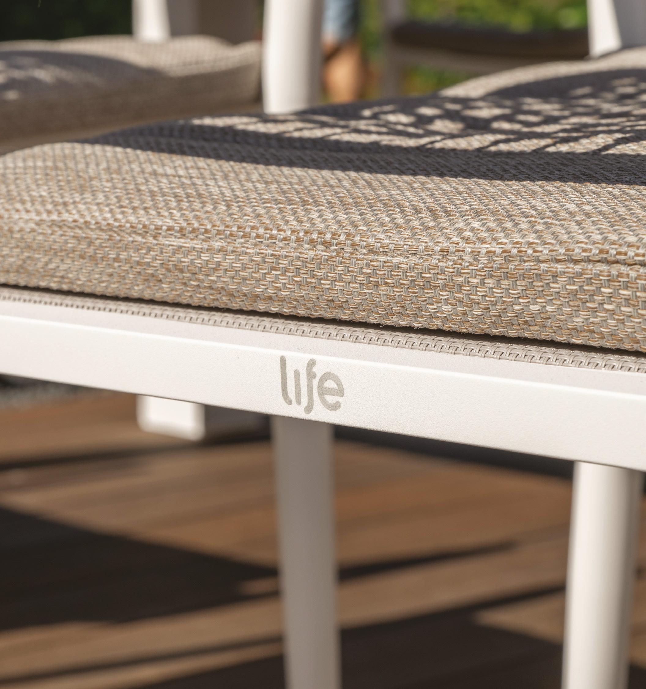 Bei Life nutzen wir eine spezielle Technik, bei der Holzstücke mittels Fingerzinkenverbindungen miteinander verbunden werden. So können wir größere und stärkere Holzplatten herstellen. Durch diese Technik verzieht sich das Teakholz weniger schnell. Dabei kann es vorkommen, dass Teile des Teakholzes aufgrund wechselnder Wetterbedingungen leicht aufgehen; dies ist normal für Teakholz.