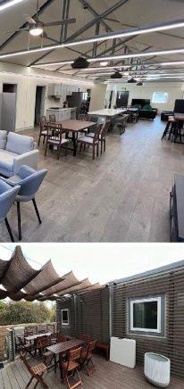 Aerial image and eye level image of interior space during site assembly of LifeArk’s Watsonville Navigation Center Project in the City of Camarillo