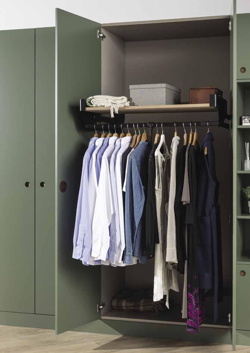 The world’s first pull-down clothing rail with an integrated shelving unit. This ingenious solution doesn’t just give far better access to higher hanging rails, but also creates an additional deep shelf in an area which is an otherwise wasted space.