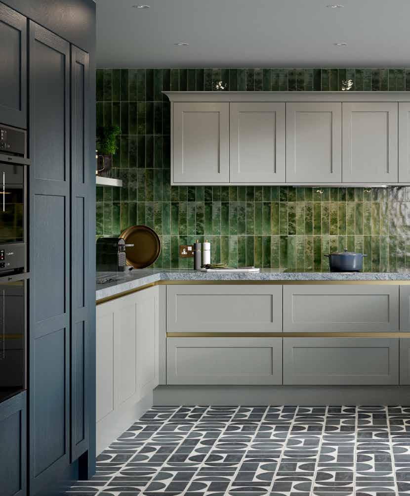Belsay Smooth shown in Reed Green Worksurfaces: Strata Quartz Pietra Charcoal
