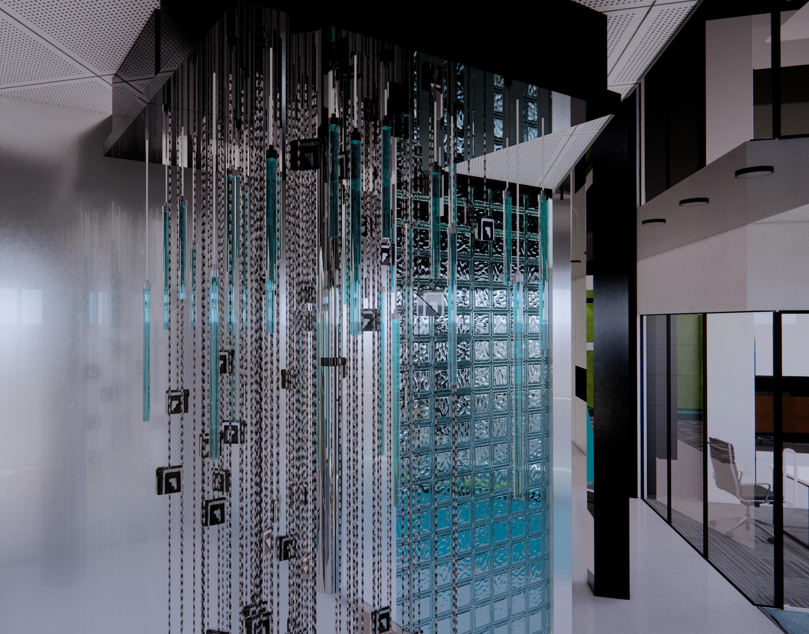 A scent installation designed for Nova Chiu is directly connected to the ceiling and the HVAC system, with a central device that doubles as a diffuser. The surrounding hanging material is made out of scented fabric.